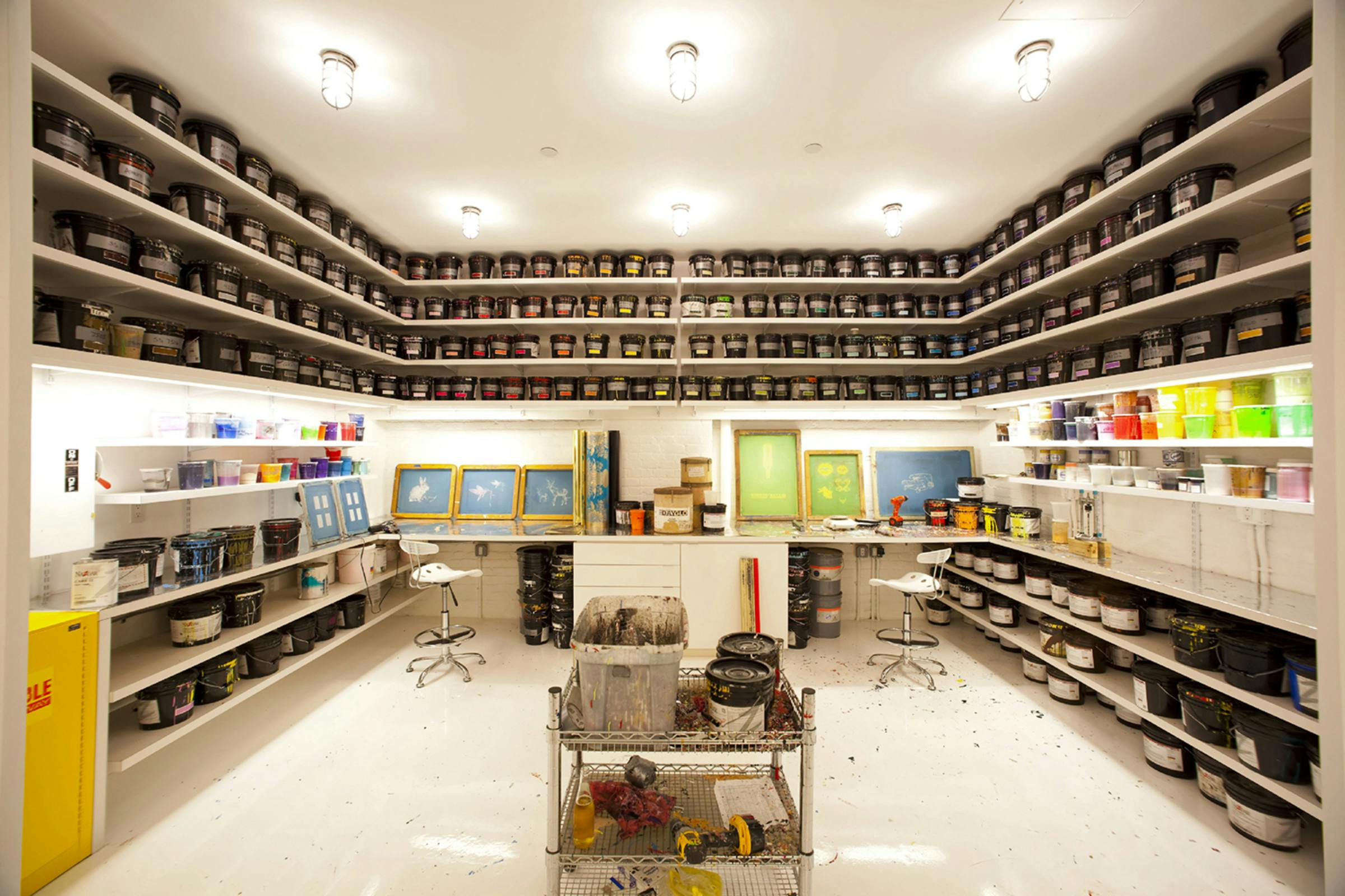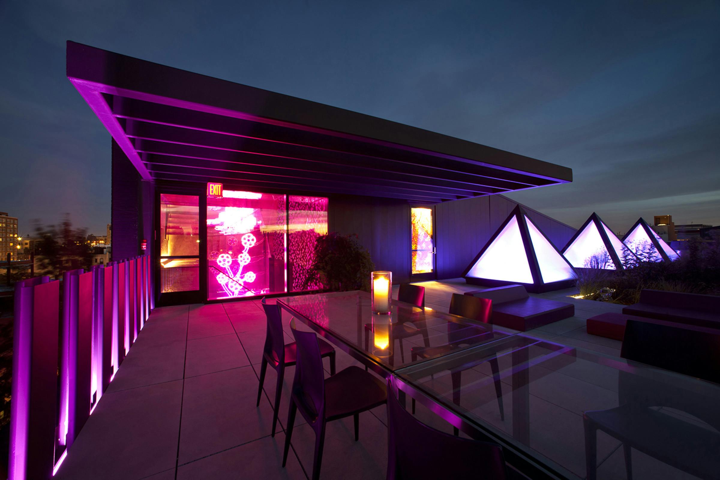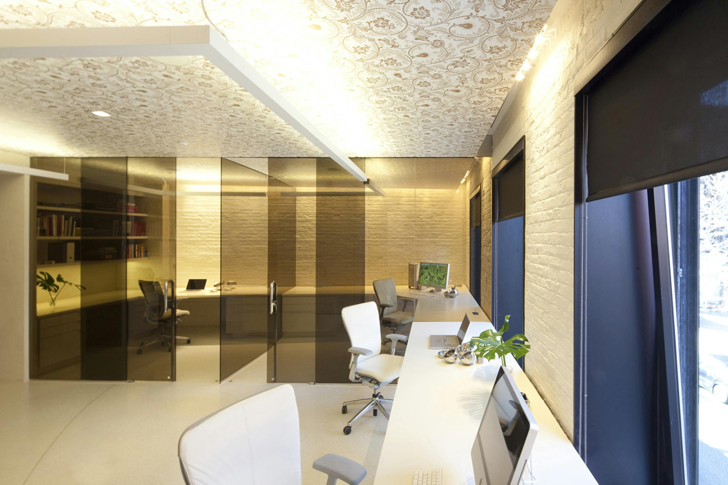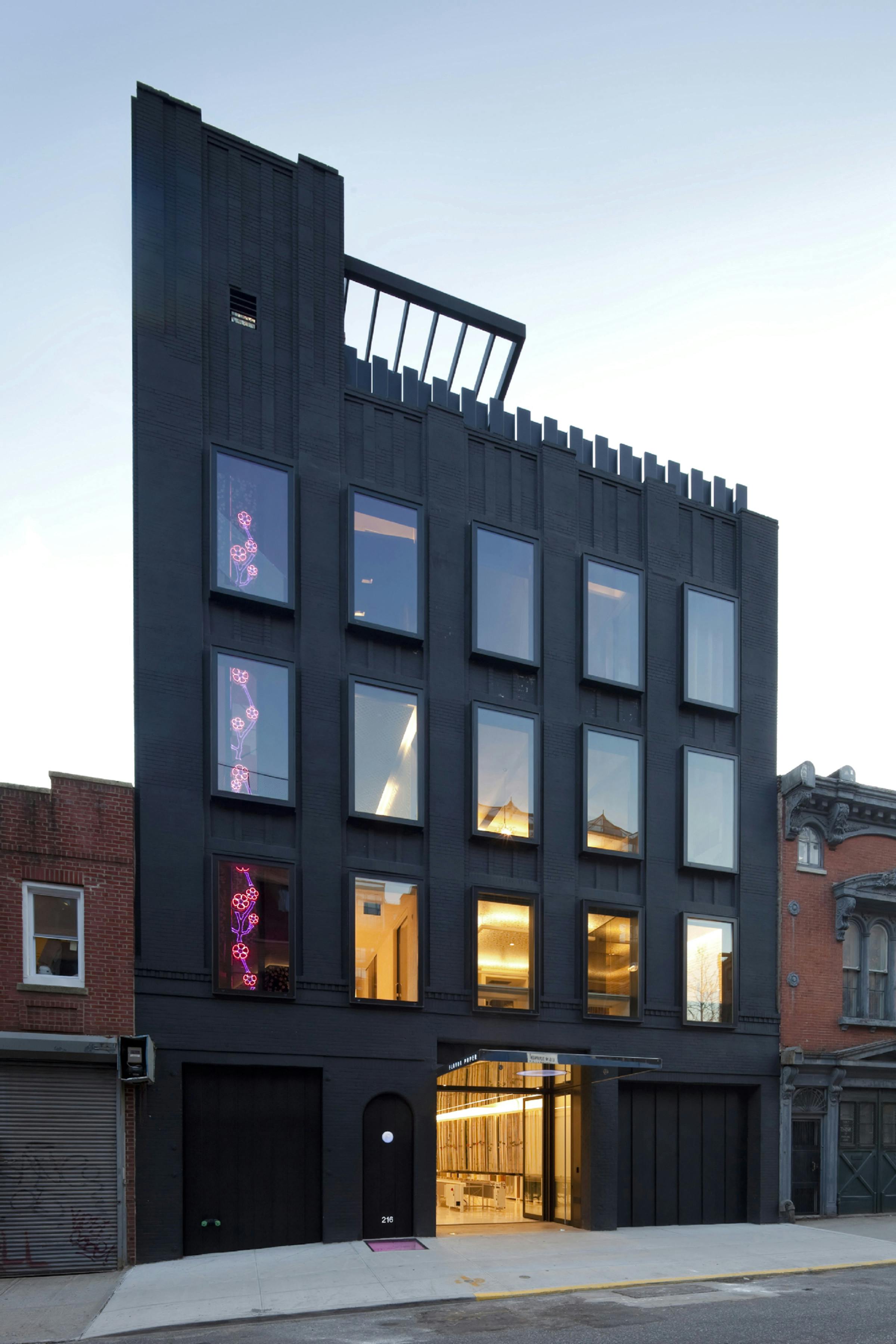 Flavor Paper is a bold, adaptive-reuse project transforming a four-story concrete parking garage in Brooklyn, New York into a 13,500 sf hybridized commercial and residential space. Specializing in custom hand screen printing wallpaper, Flavor Paper needed a new space for wallpaper production as well as a comprehensive way to showcase it to the public. Skylab converted the former parking structure to house the production facility, showroom, as well as two residential levels and an eco-roof deck. Two 50 foot long wall- paper screening tables were placed in the middle of the ground floor space allowing the mirrored ceiling to reflect the color and pattern of the paper, transmitting it out through the glass canopy to the street and the pedestrian traffic strolling by. Overall, the project was an experiment in creating a multi-use space that not only served functional production needs, but also added aesthetic beauty and cultural relevance to the neighborhood.