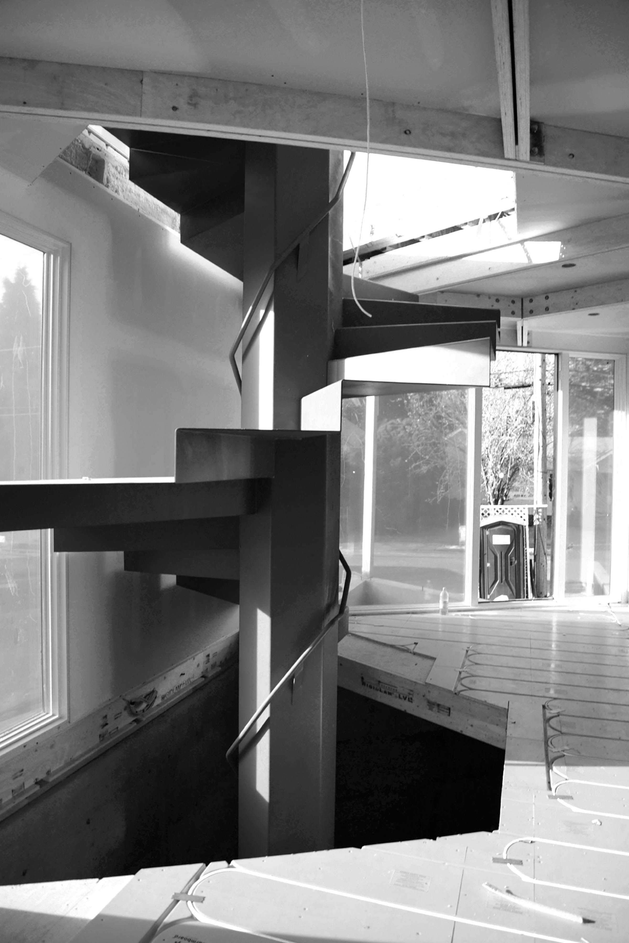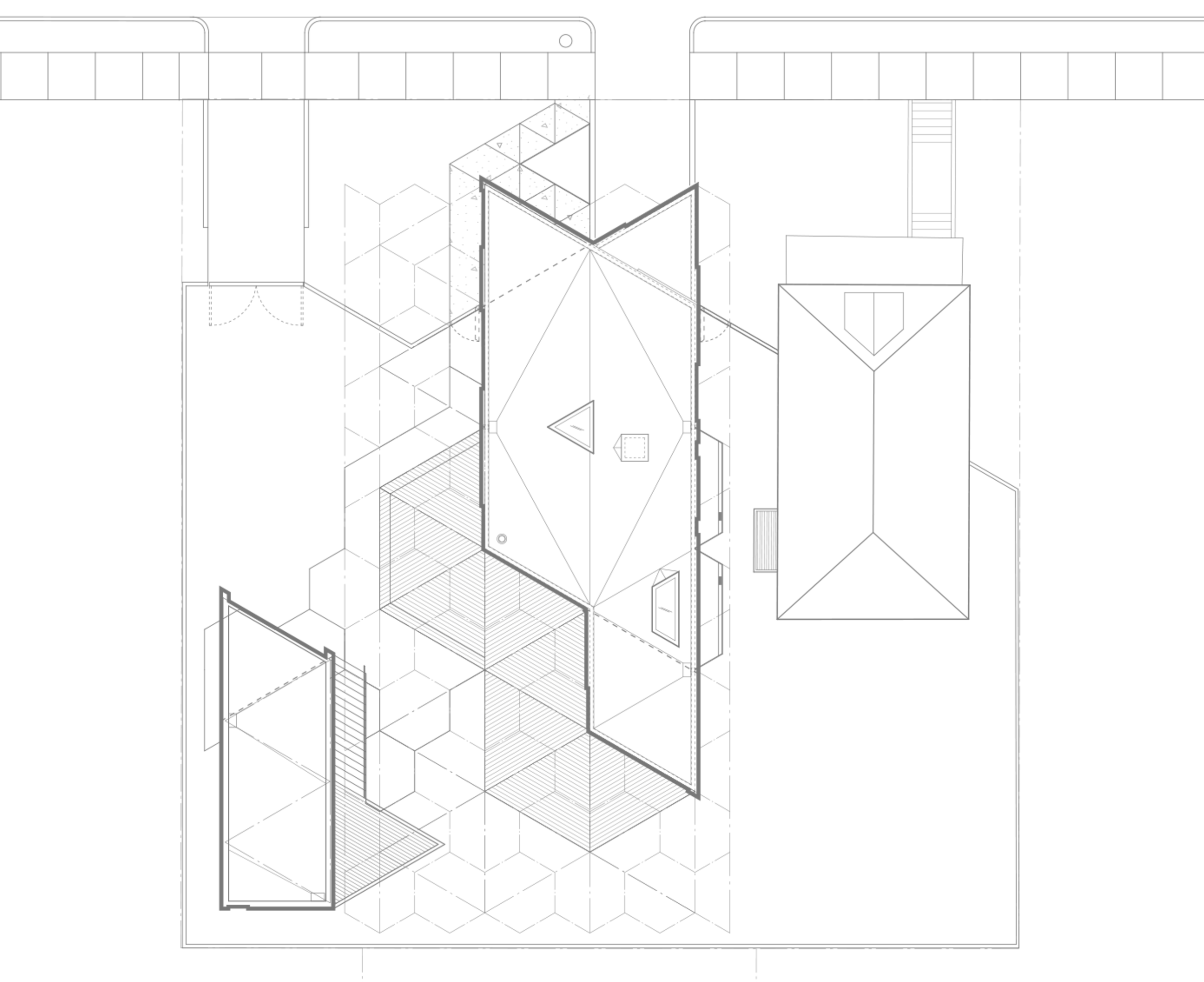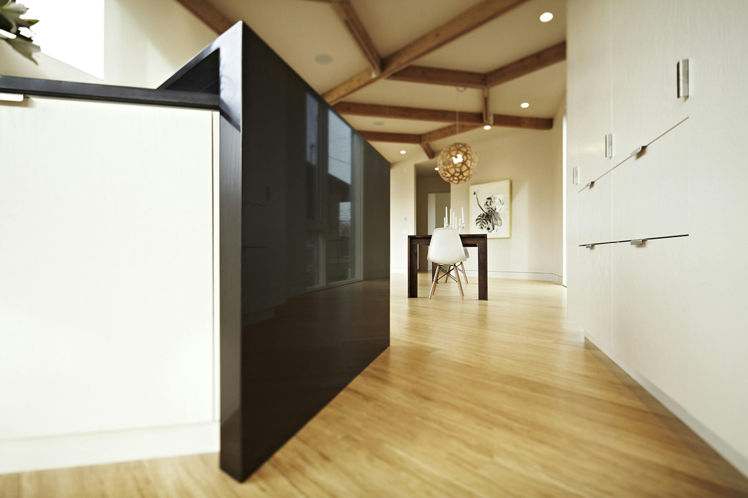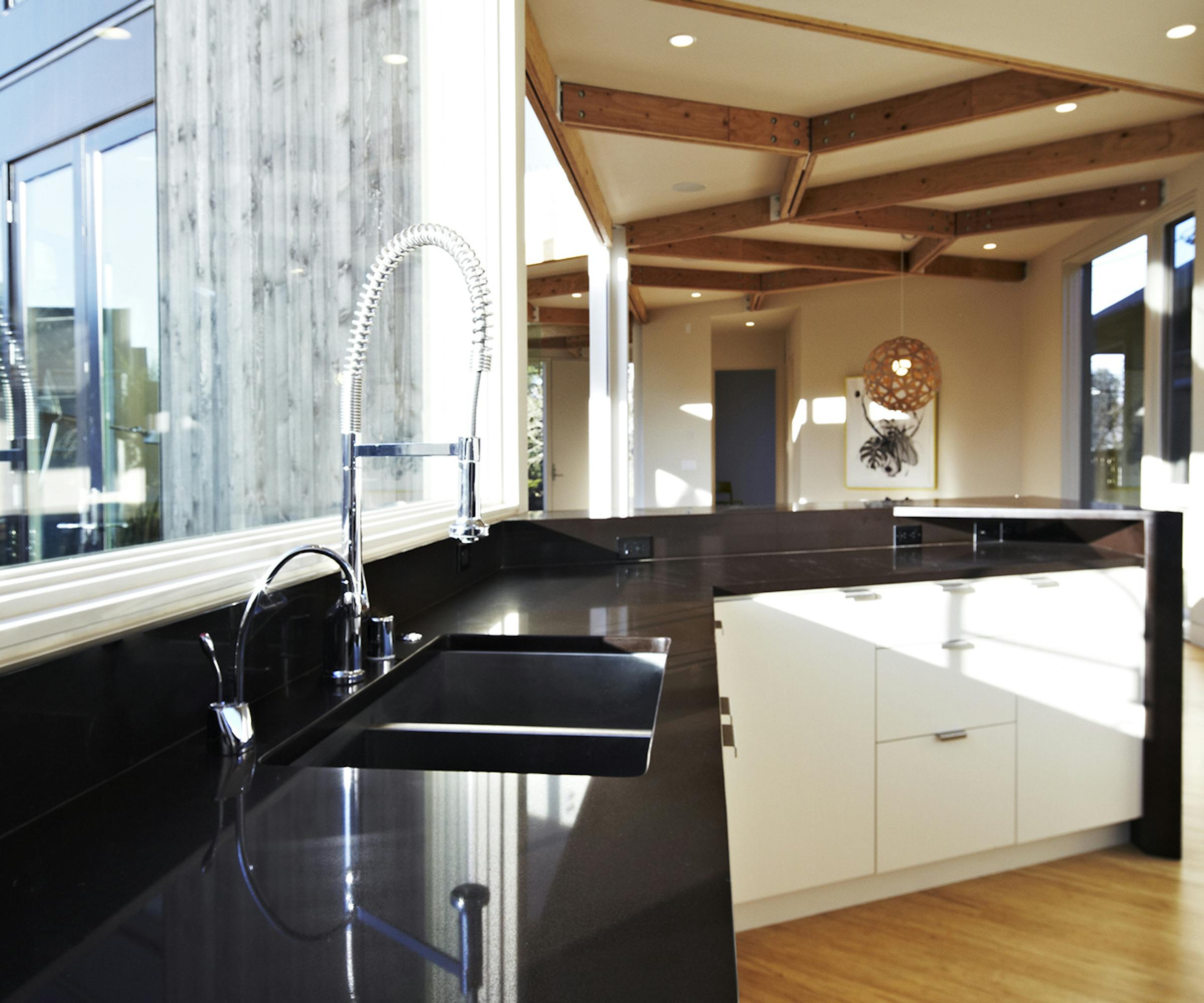 Situated on a steeply sloping urban infill site, the property is a modest 20-feet-wide. Outside, the house is wrapped with a blackened cedar rainscreen that rests over two inches of rigid insulation plus blown-in insulation within the walls. Inside, the open plan features a combined living, kitchen, and dining area, with four bedrooms and three-and-one-half bathrooms. The interiors are bright, with ample daylit spaces highlighting the exposed timber ceiling and hardwood floors. The bathrooms are lined with a custom hexagon tile and pattern that was set in the shop prior to delivery. Home systems include radiant in-floor heating, a heat recovery system, and a 6-kilowatt rooftop solar array installed on the rooftop. Stormwater from the roof is managed via flow-thru planters that are integrated into the landscape design to minimize site run-off. An additional separate accessory dwelling unit was built as part of a second phase for a home office and storage.