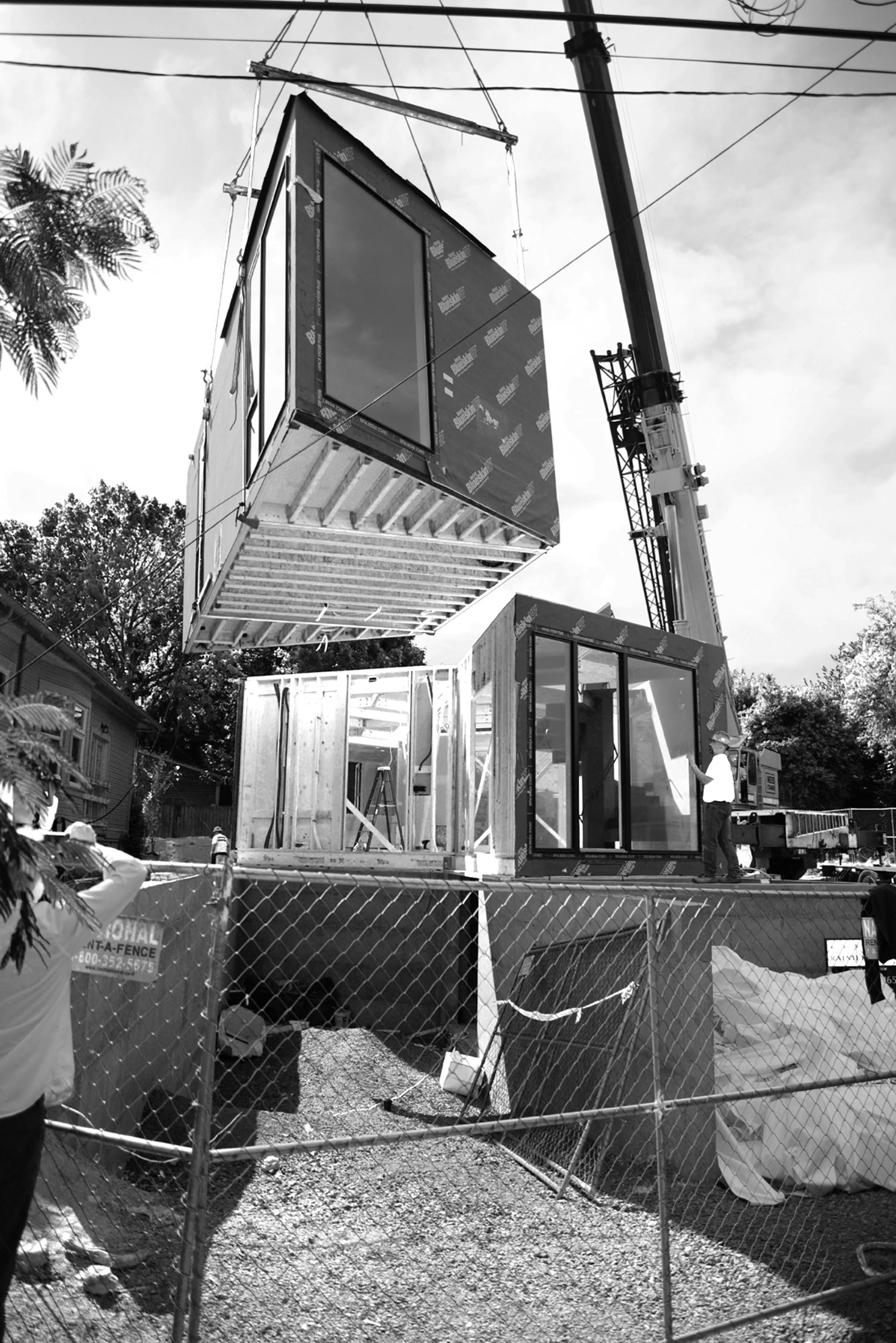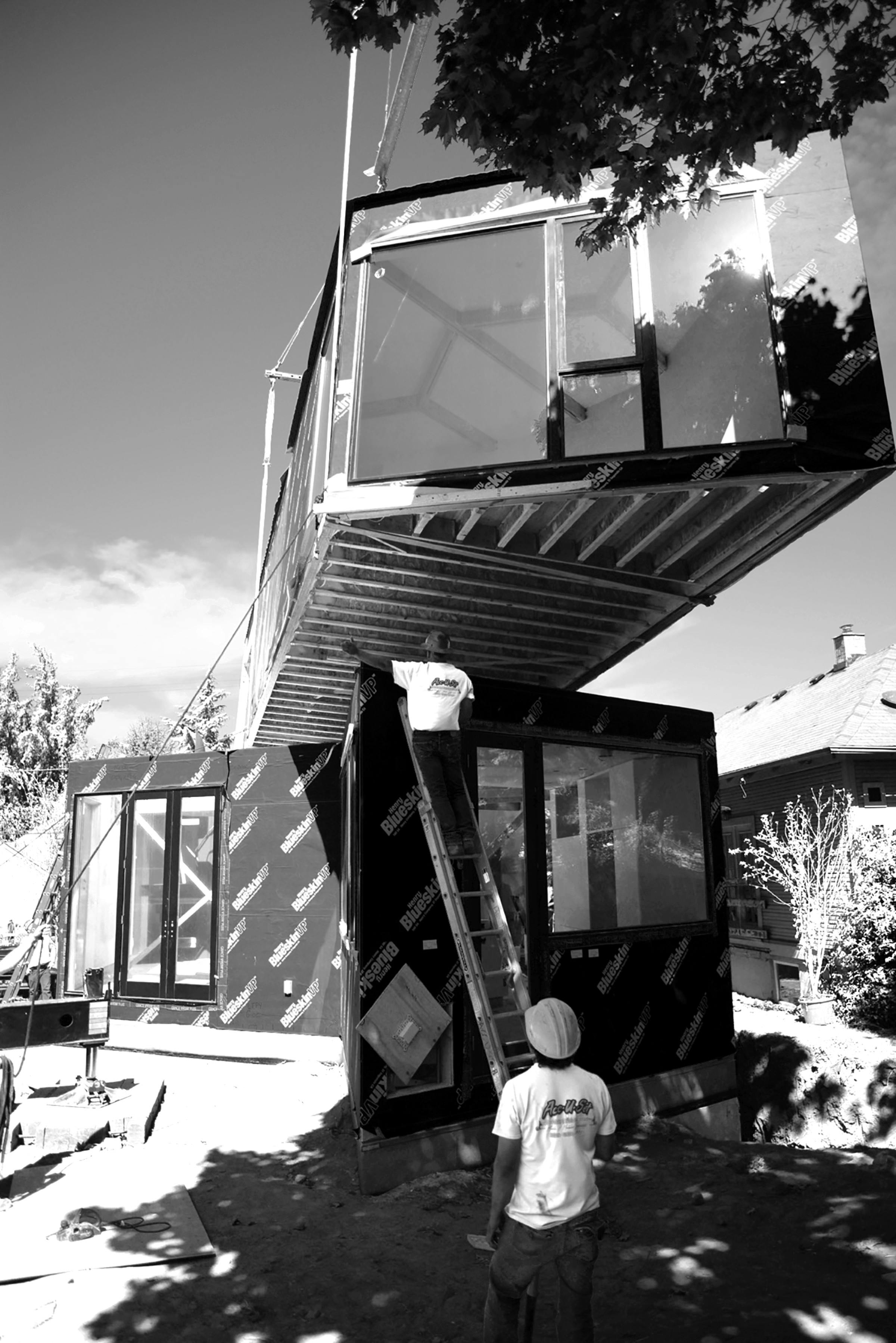Capable of a wide range of assembly configurations, when fit together, the modules create a structurally efficient system. For construction, tyhe building components for the house were divided and shipped to the site via a convoy of six trucks, each carrying 600 square foot of prefabricated modular volumes per truck. With the foundation completed prior to delivery, on-site installation was accomplished within a single day.