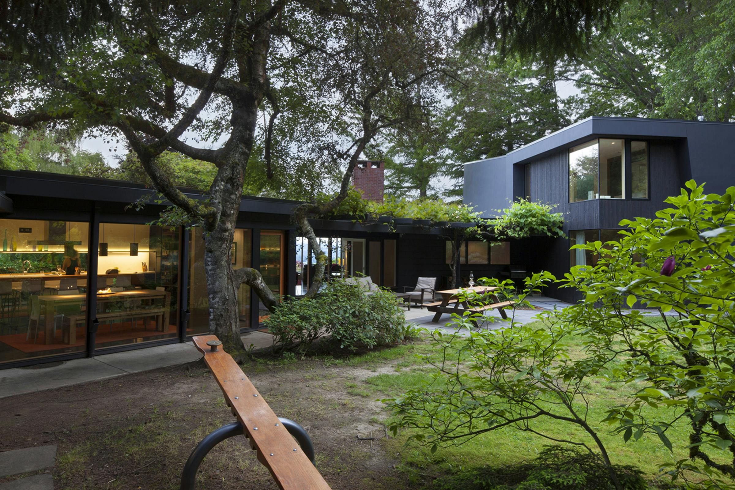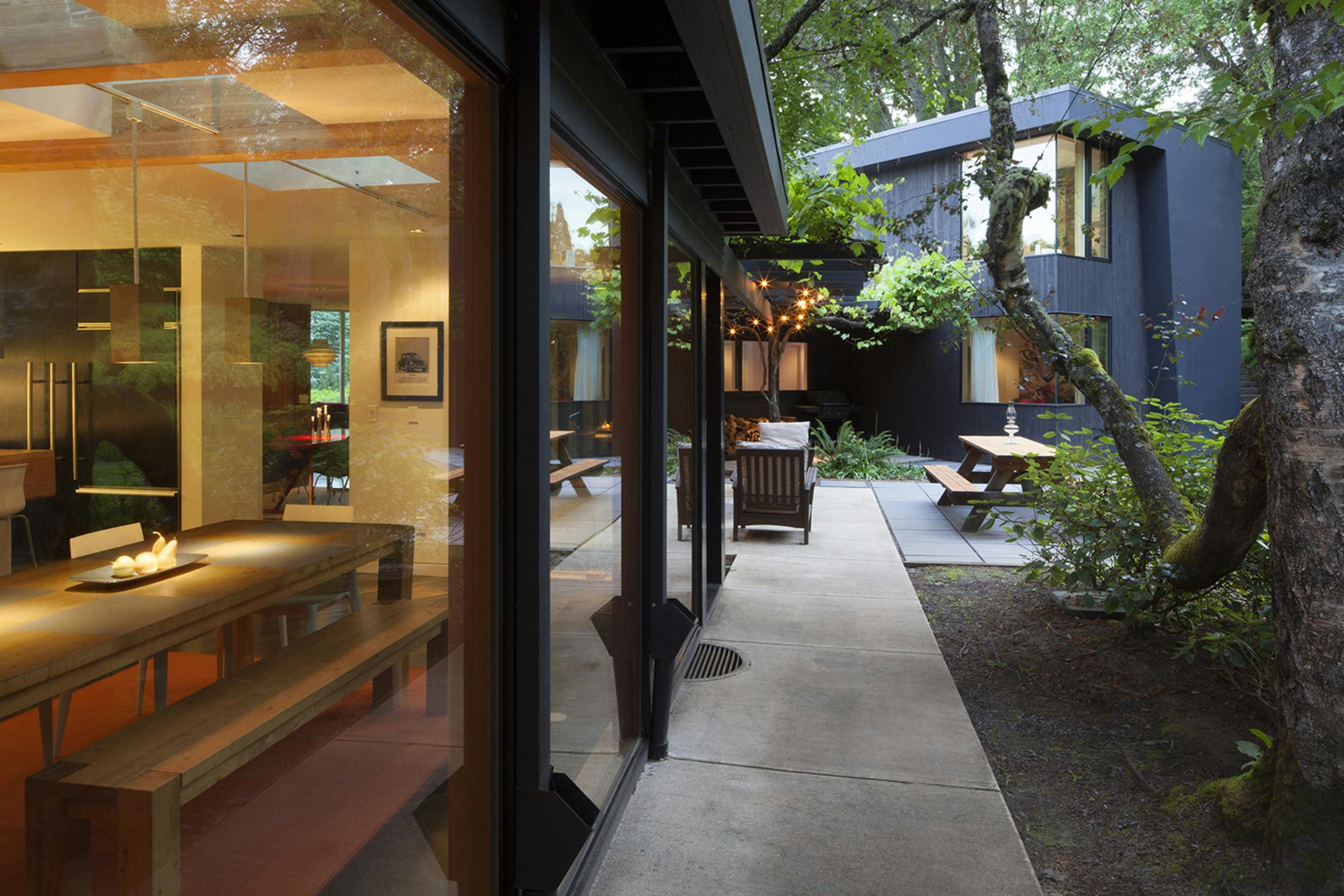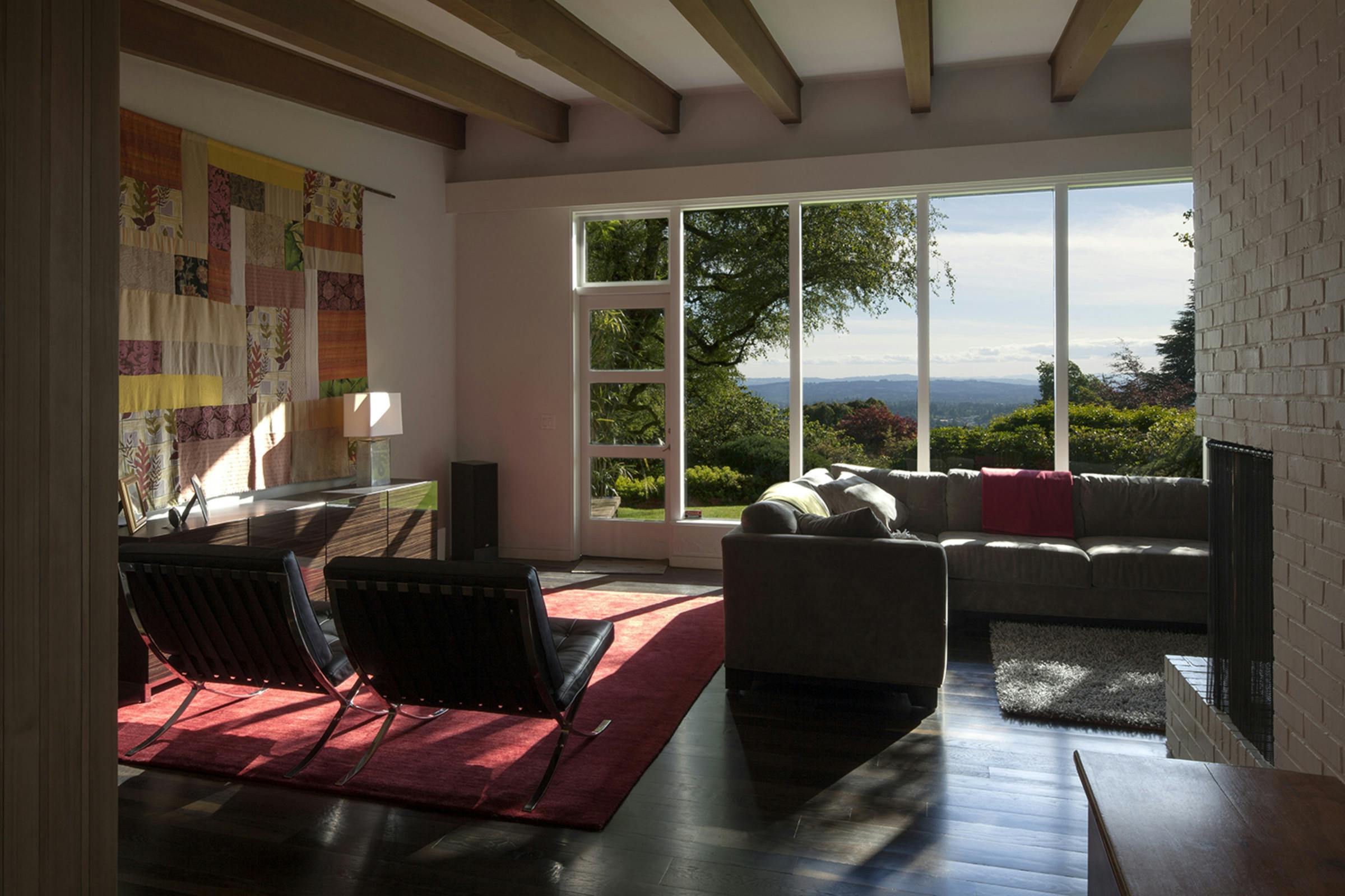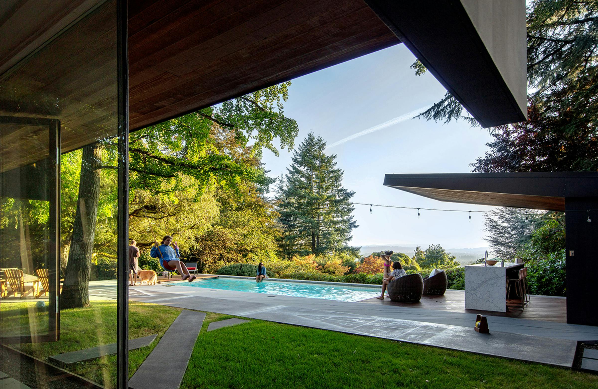 Located in NW Portland hills, the Meschter Residence is a remodel and expansion of a mid-century modern residence. The new home is nestled in a lush Pacific Northwest wooded landscape and a secluded courtyard, connecting with the pine forest. The home is positioned to capture spectacular views of the hills and beyond to the west.