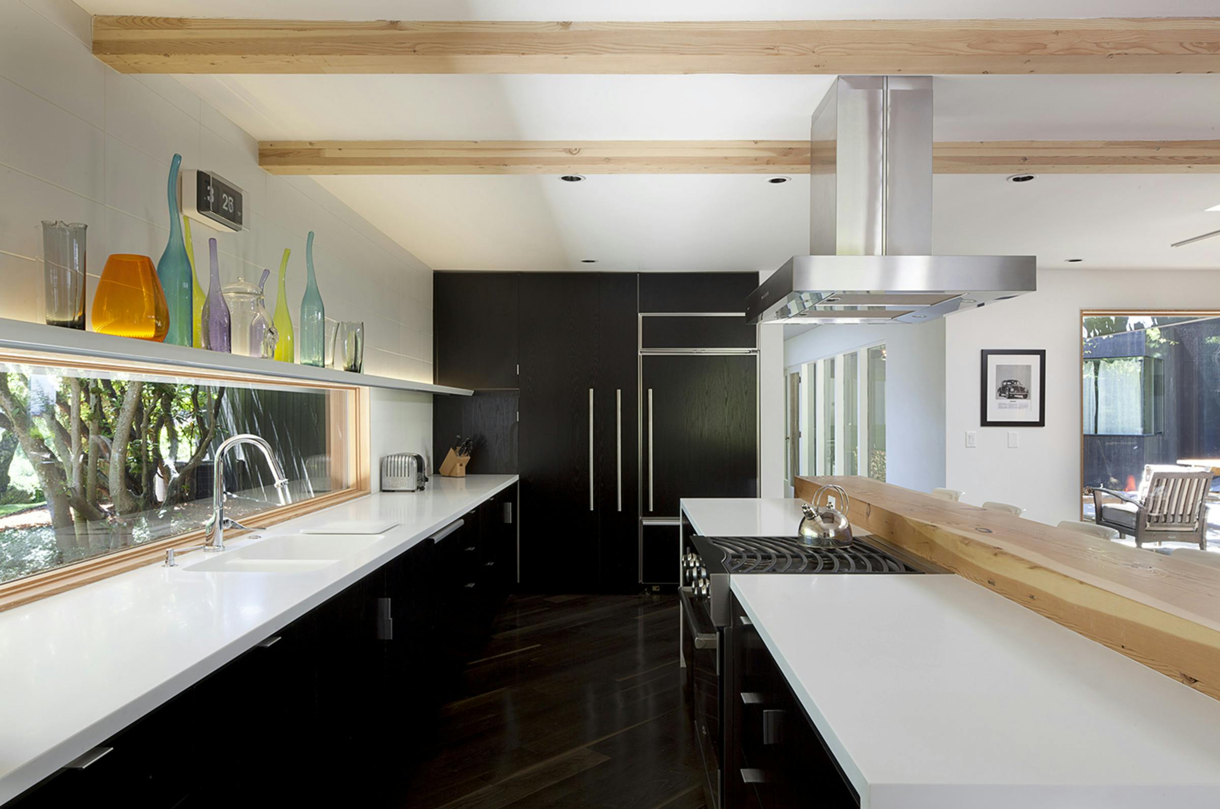 Within the original wing, the kitchen is expanded and relocated closer to the main entrance with an addition of an open dining room. The adjacent wing is a casual living area and office space with views of the horizon and pool.