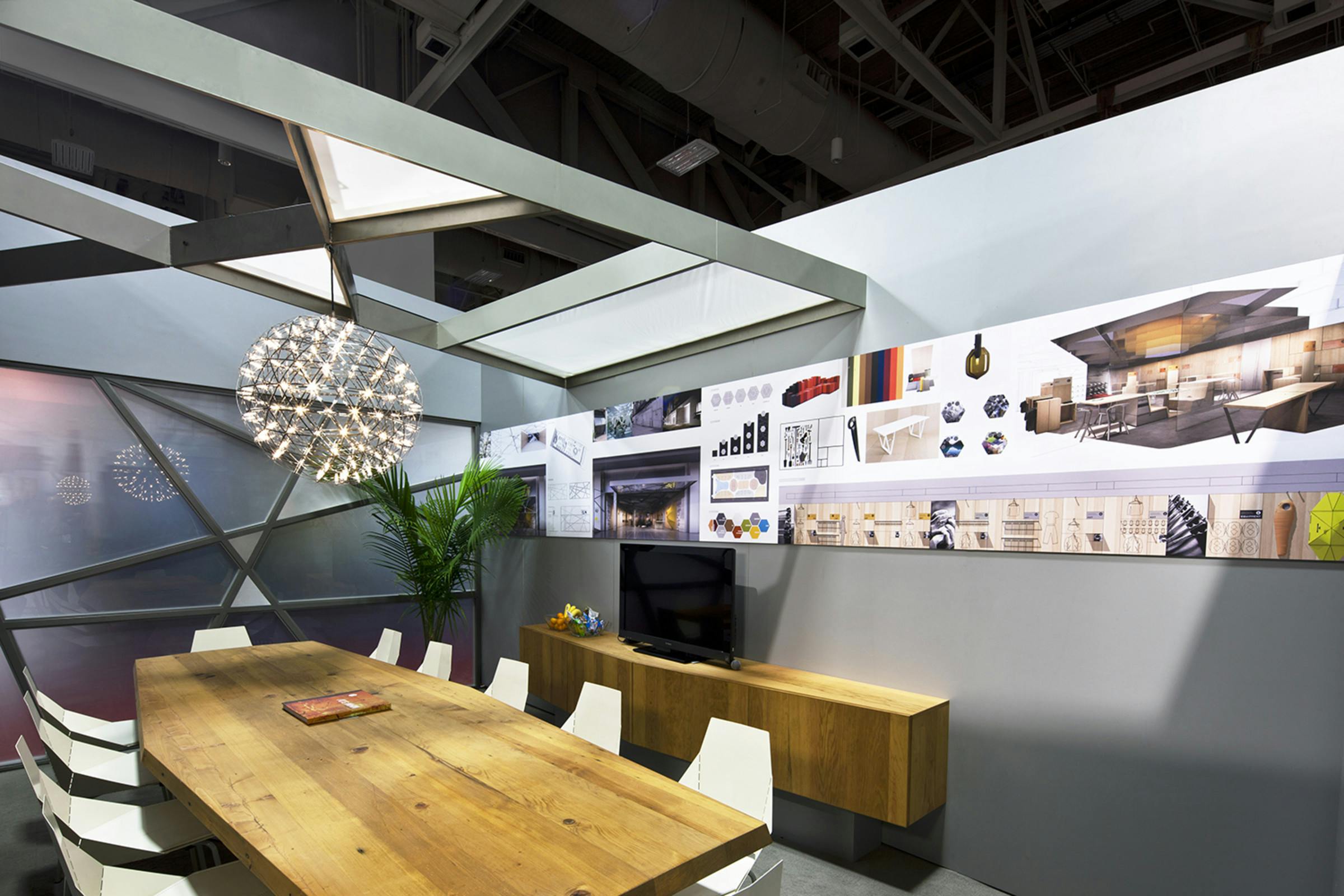 The tradeshow pop-up booth was a prototype design, experimenting with product families and curated “face out” displays. The environment of the tradeshow concept was a hardware lounge with a featured product arrival experience, bar and lounge central area and service counters met with representatives. This shop experience was a model for future development of MHW retail stores. The primary idea was more efficiently racking product showing less to control the volume of product displayed and elevate the brand with curated product families in the experience.