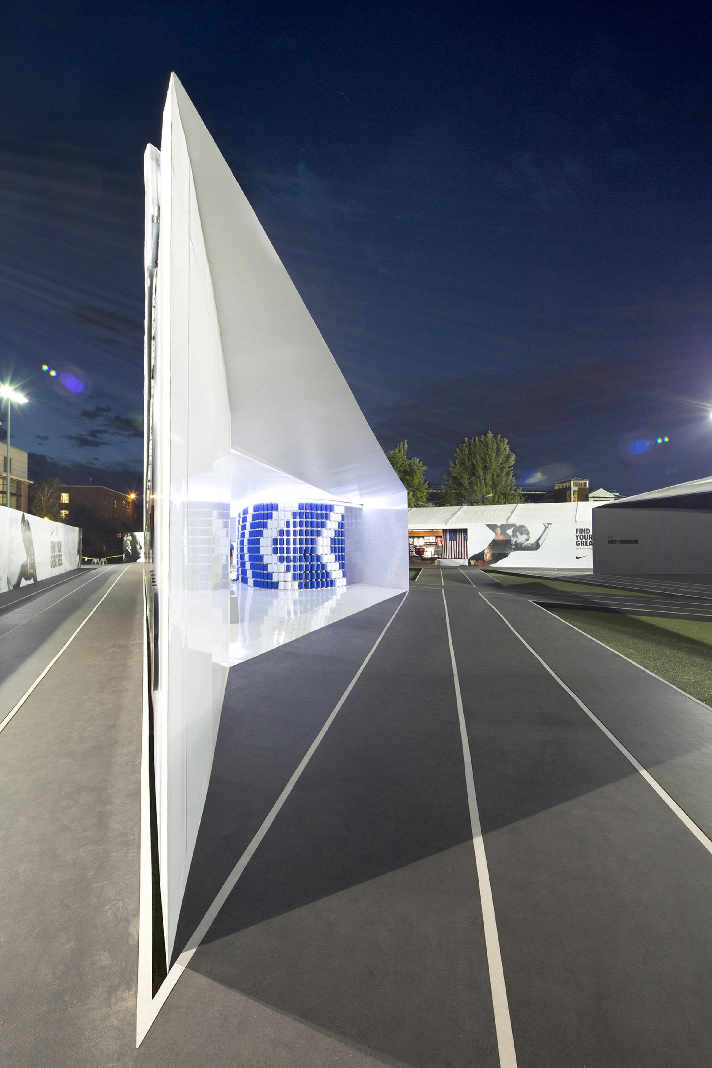 Camp Victory was a temporary exhibition showcasing Nike innovations during the 2012 United States Olympic Trials for Track & Field. Inspired by the visualization of kinetic energy, a stunning network of fabricated tensile pavilions were created. Like sprinters exploding out of the starting blocks, the pavilions were made to lean and cantilever, pushing the limits of structural and physical boundaries.