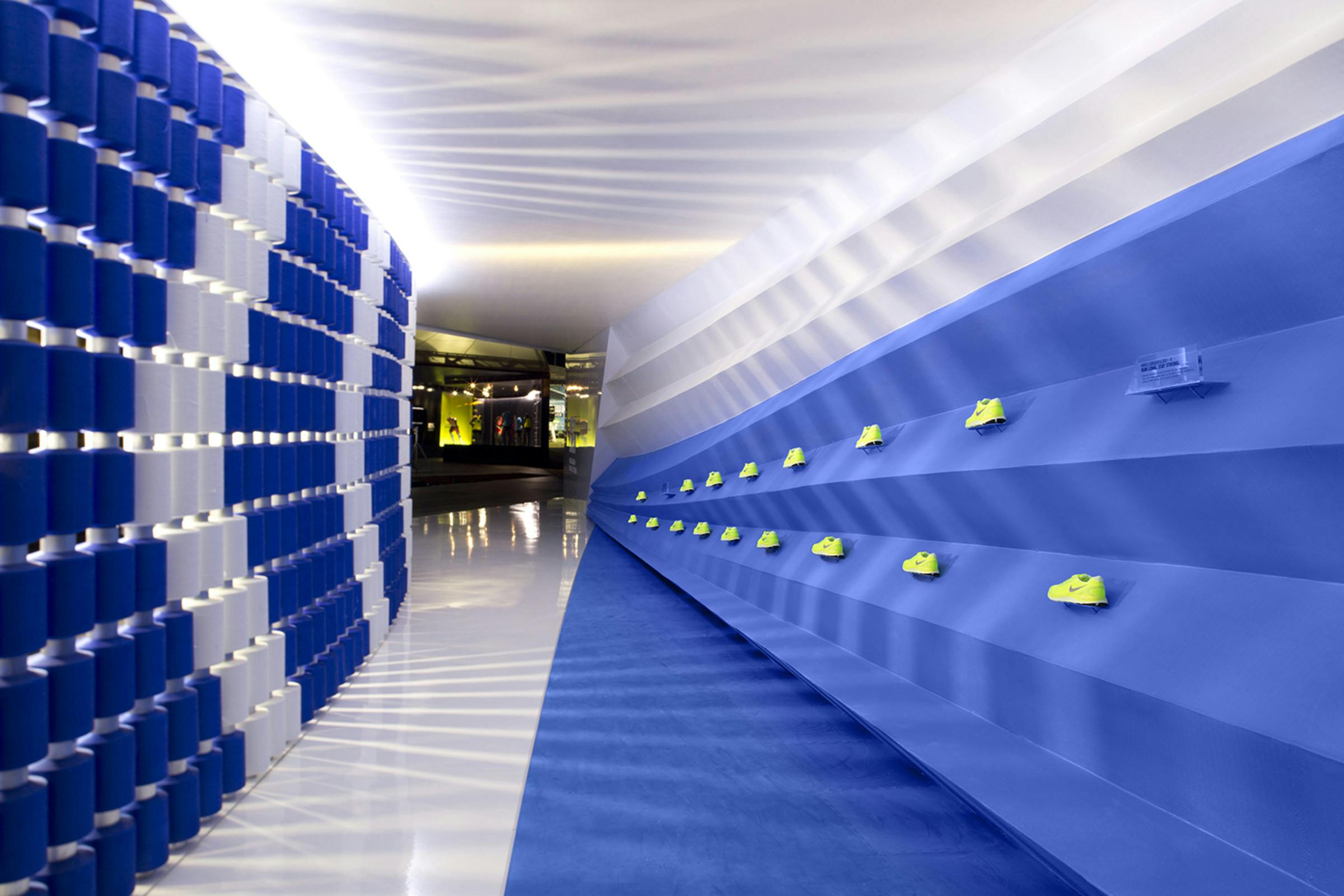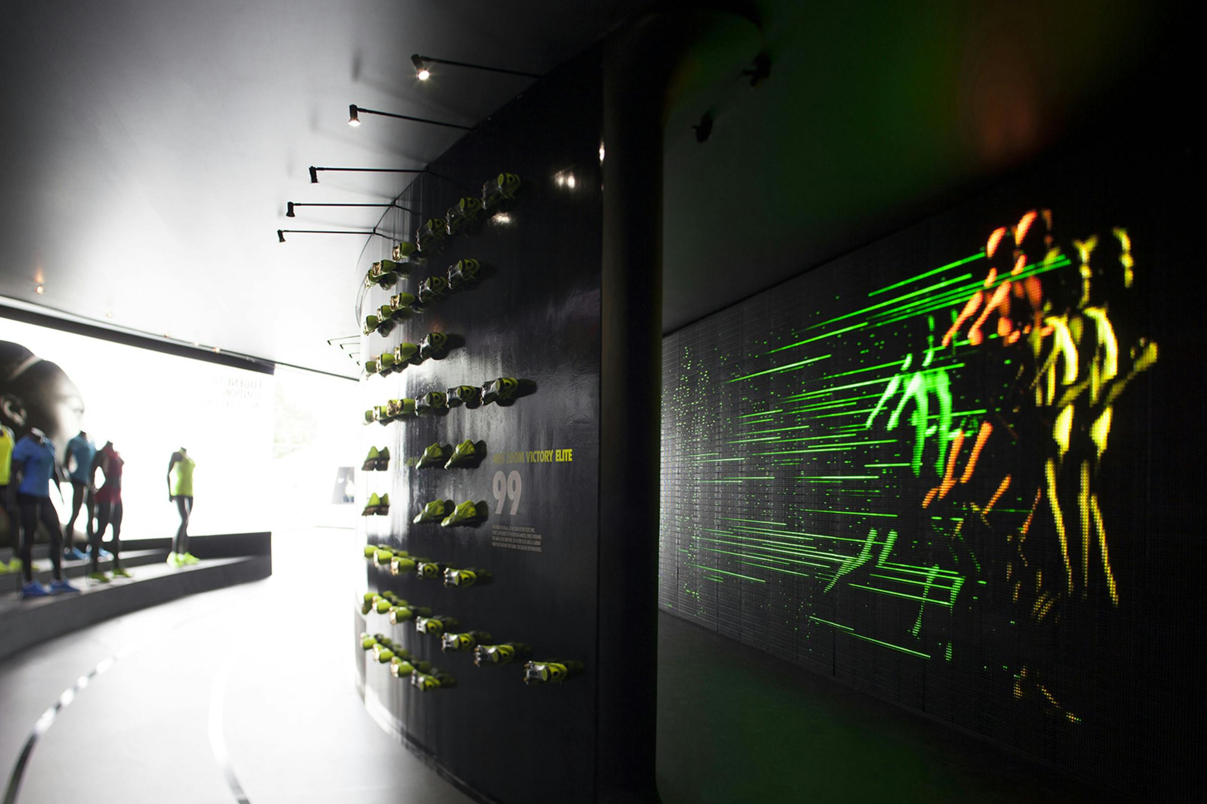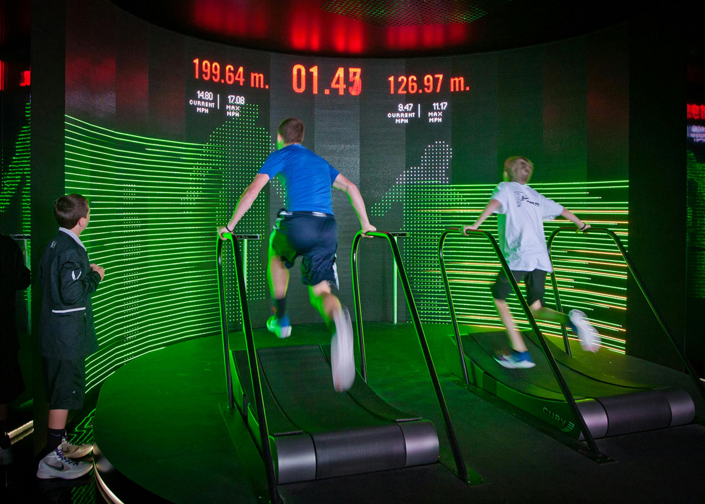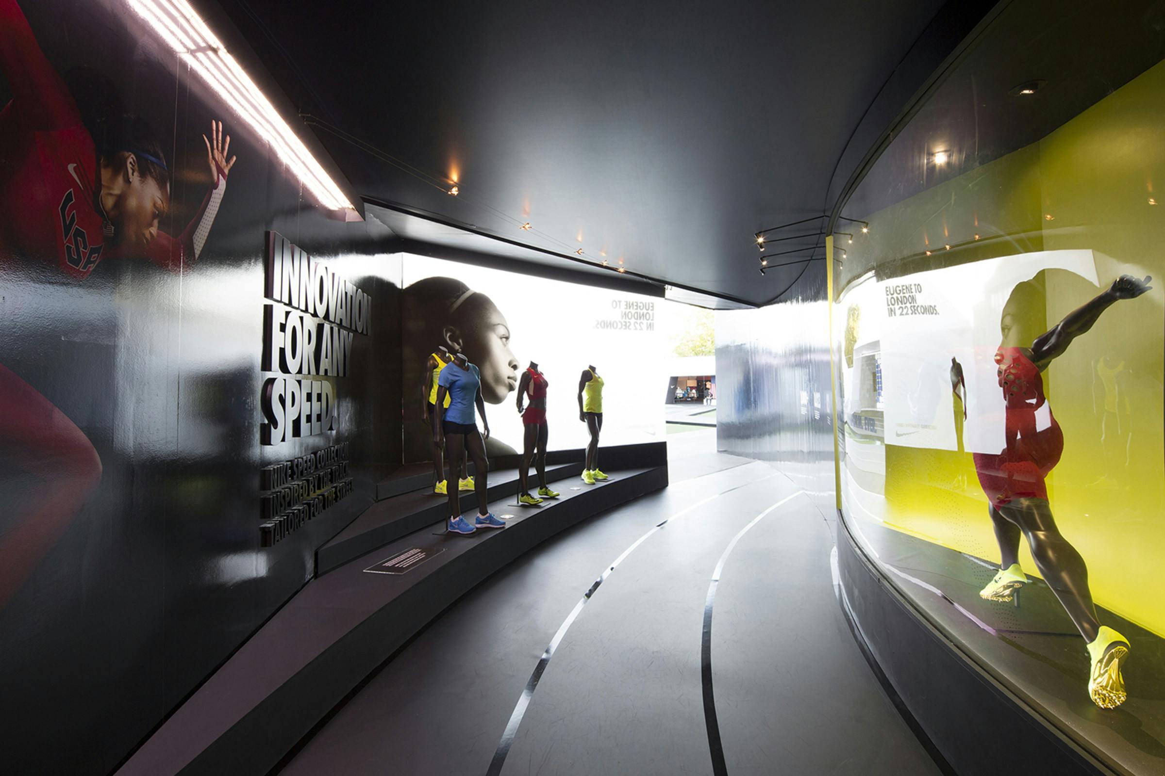 Rooms and experiences were created using sharp corners and extreme angles, always communicating the feeling of movement and speed to the audience. Building materials were not only used to define unique physical spaces and facilitate flow throughout the exhibit, but also to broadcast content via immersive media that was interwoven throughout the site. For attendees, the experience was a rare opportunity to get close to the innovation, technology and raw talent surrounding the most elite athletes in the world.