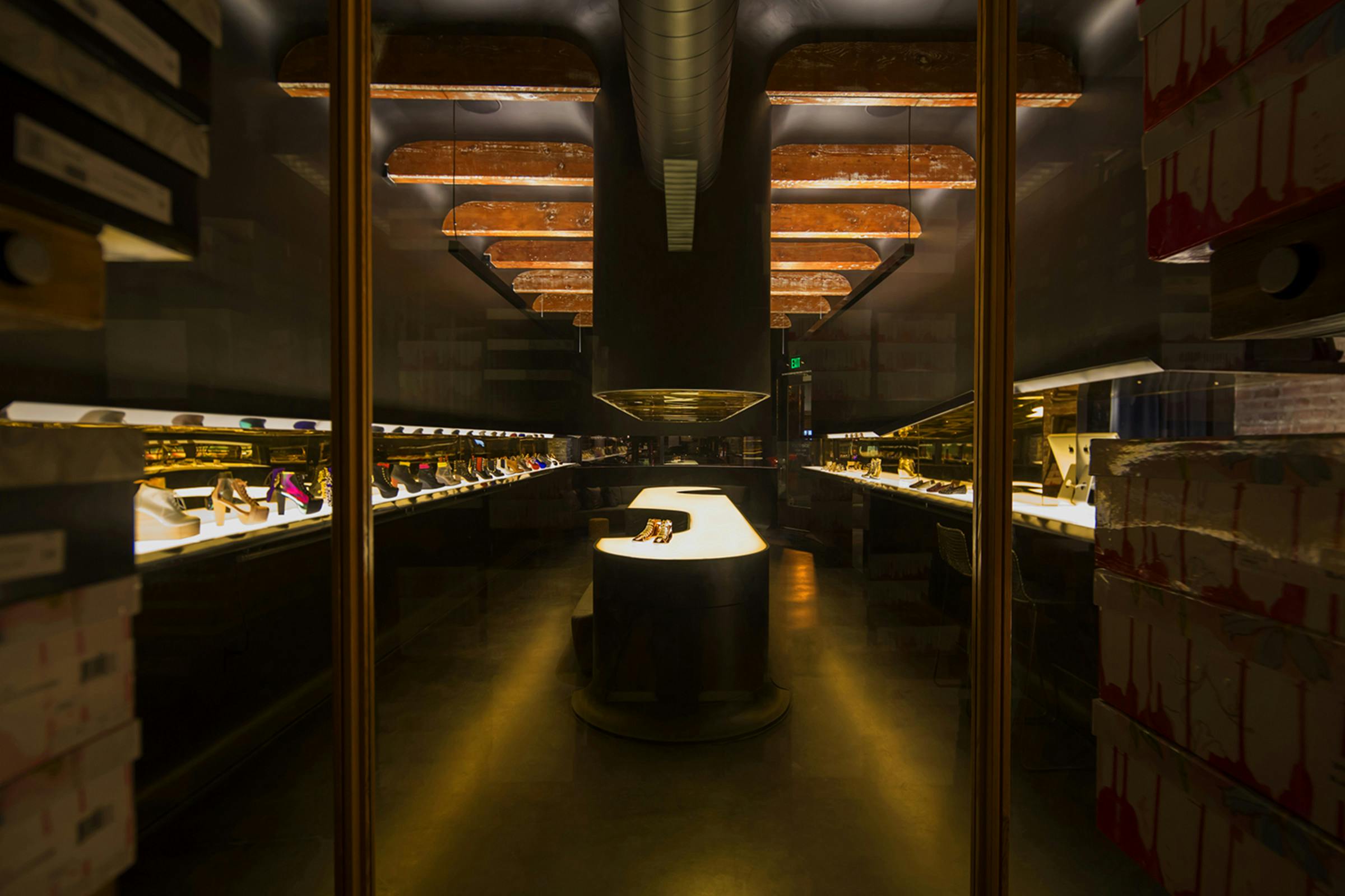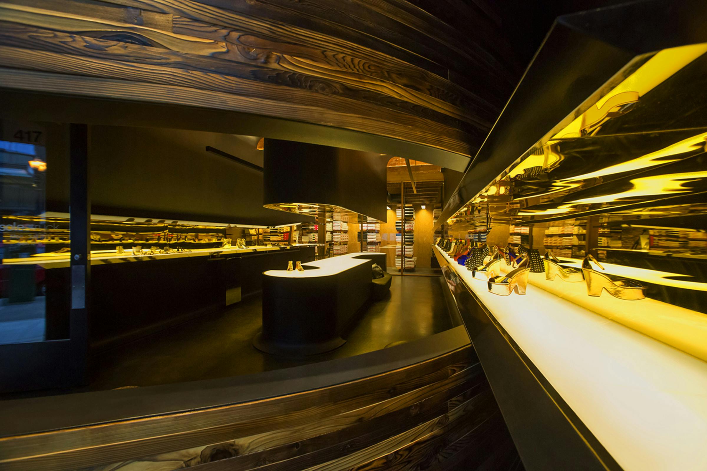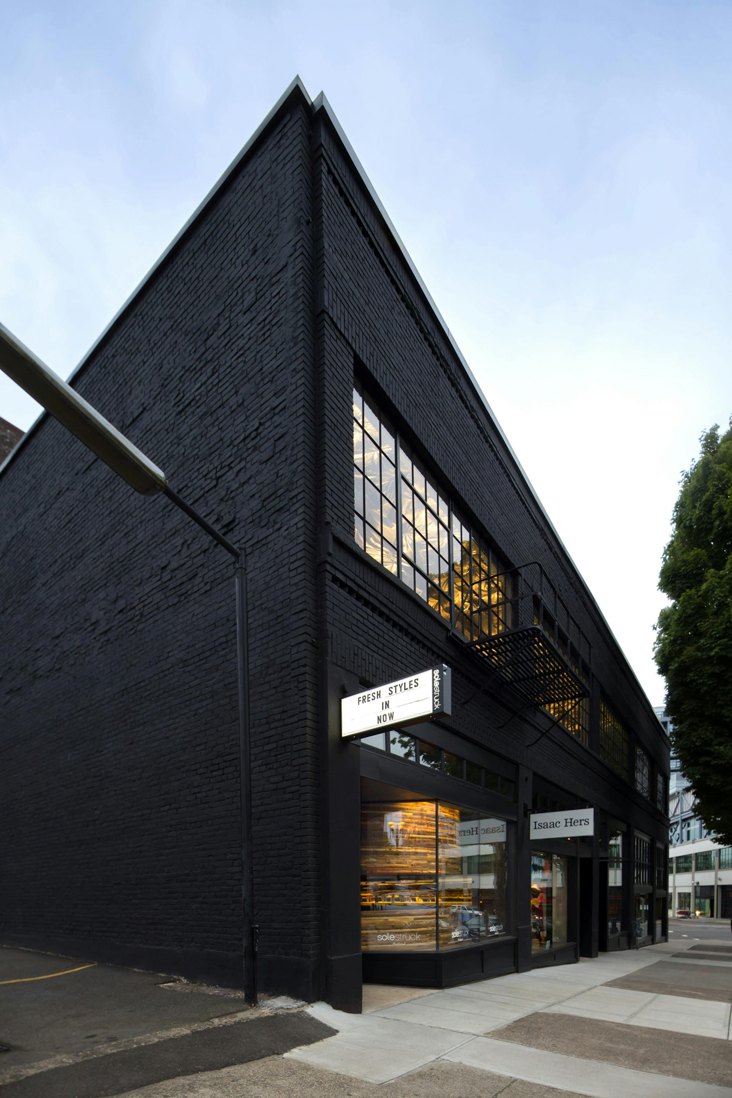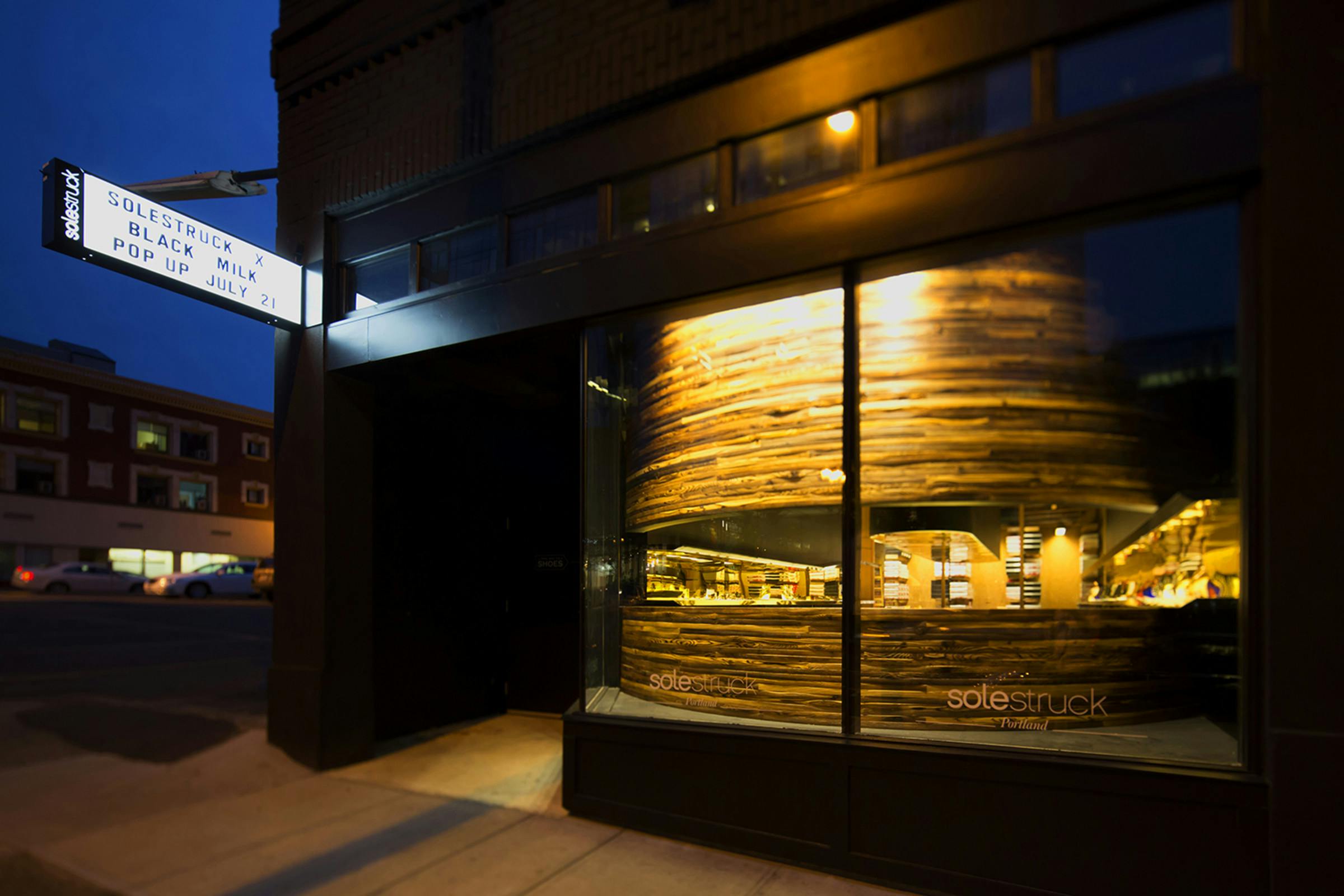 Solestruck’s mission is “to rid the world of ugly shoes, one pair at a time.” For their flagship retail store, the popular web-based company selected a space in Portland’s Blackbox retail project. The display zone is a high concept “shop-dark” where the all-black concrete floors, textured-coated walls, and brake form metal shelves fade away to reveal glowing swaths of light that dramatize curated exhibits of shoes. Carved and coved out of a columnar structure, the central cabinet integrates display & storage space, as well as custom-upholstered seating notched into the mass.In contrast to the drama of the display zone, the back-of-house is warm and expressive. Drawing on a wine cellar concept, backstock storage is exposed and celebrated as a collection. Clad in cork and exposed brick walls, this secondary zone is highly visible yet just out of reach to the public, separated by a floor to ceiling glass wall. By virtue of the frequent events and collaborations held in the space, the expanses of glass at the storefront and back of house provide ample space for ever-changing vinyl graphics. A custom marquee-style sign on the exterior alerts the neighborhood and clientele of upcoming events. Dramatically contrasting the dark and light elements of the shop and providing a flexible, versatile environment make this space the ultimate shoe store and event space.
