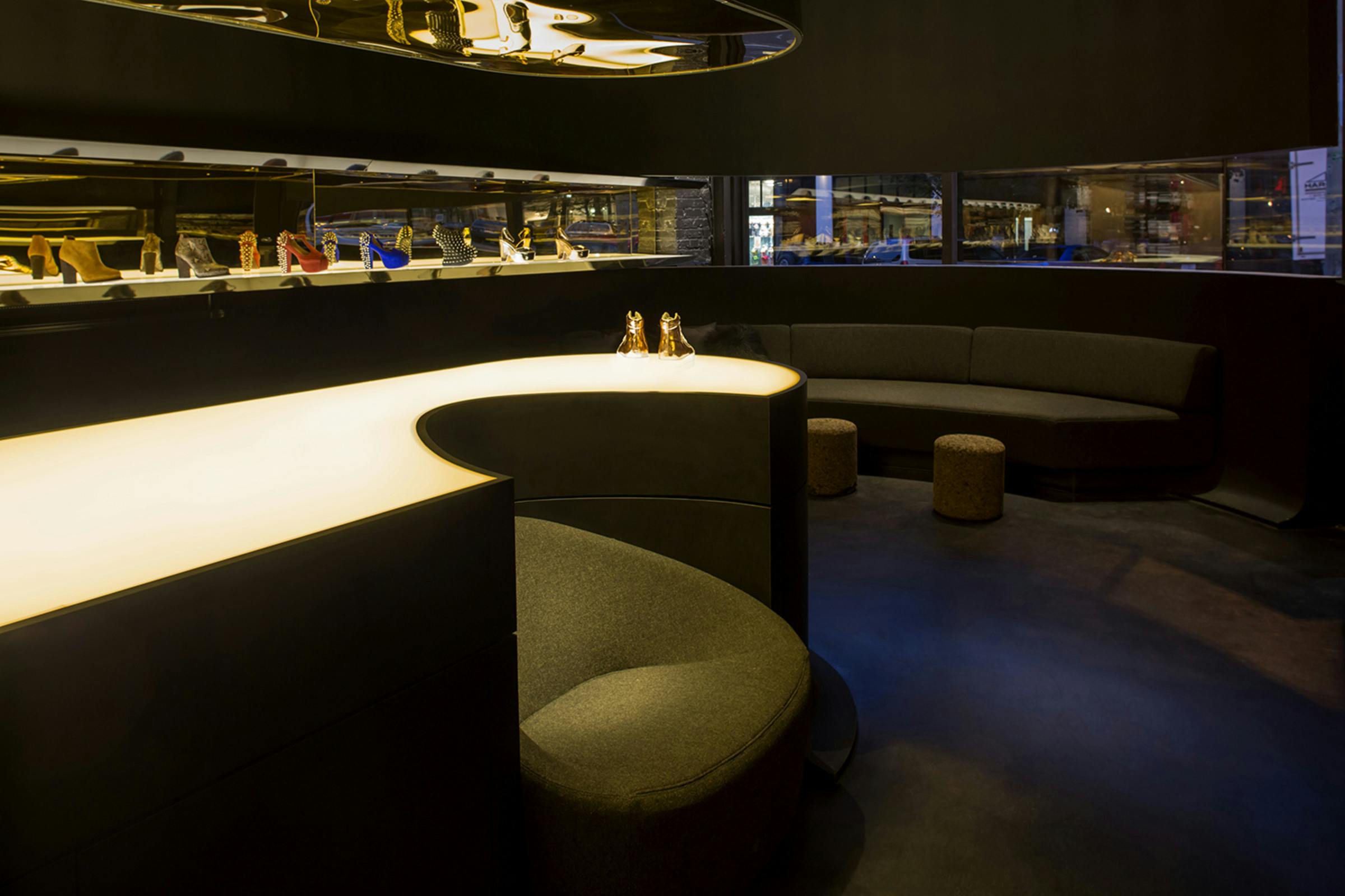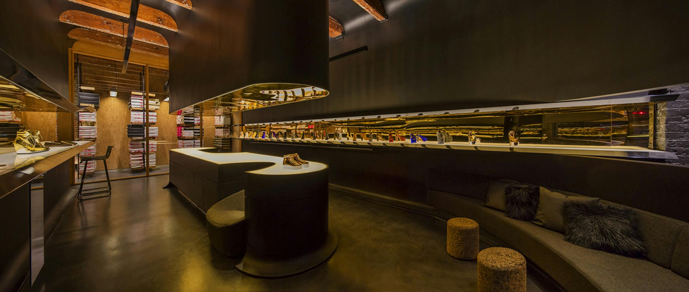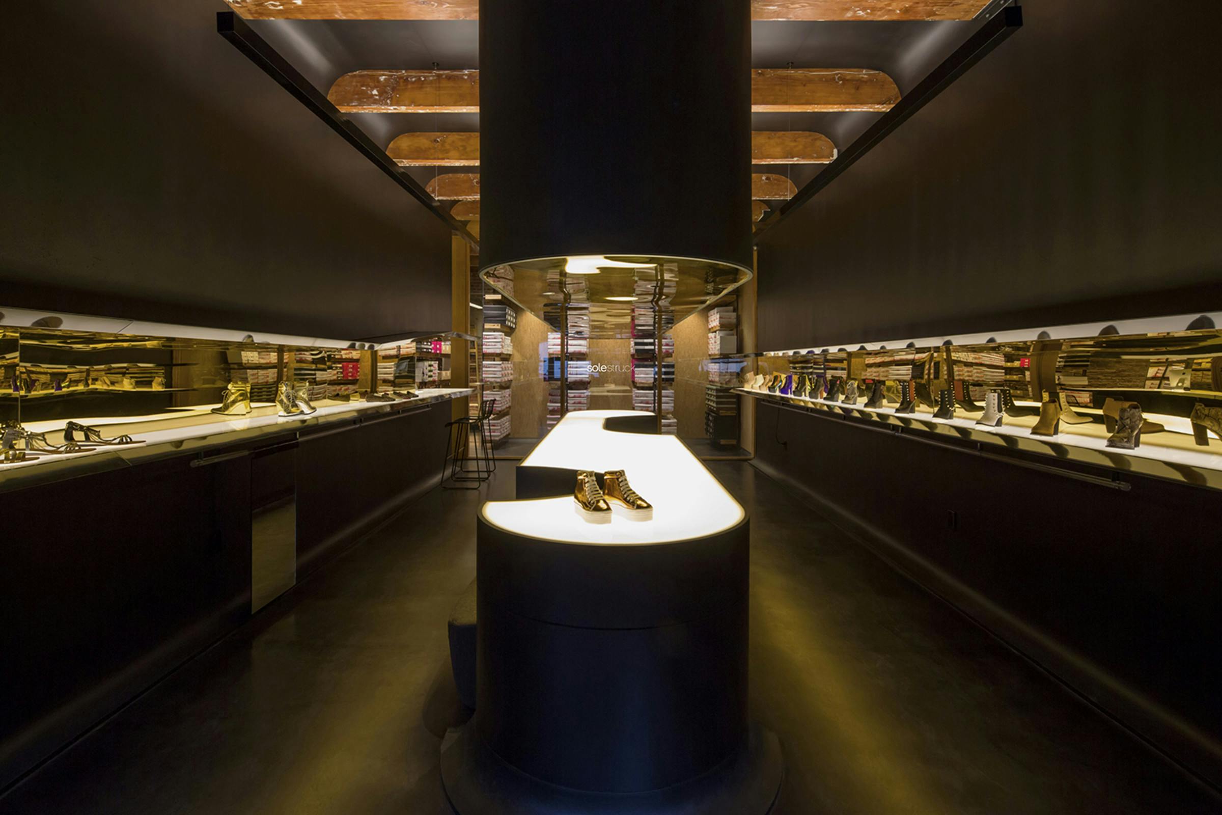 Solestruck’s mission is “to rid the world of ugly shoes, one pair at a time.” For their flagship retail store, the popular web-based company selected a space in Portland’s Blackbox retail project. The display zone is a high concept “shop-dark” where the all-black concrete floors, textured-coated walls, and brake form metal shelves fade away to reveal glowing swaths of light that dramatize curated exhibits of shoes. Carved and coved out of a columnar structure, the central cabinet integrates display & storage space, as well as custom-upholstered seating notched into the mass.In contrast to the drama of the display zone, the back-of-house is warm and expressive. Drawing on a wine cellar concept, backstock storage is exposed and celebrated as a collection. Clad in cork and exposed brick walls, this secondary zone is highly visible yet just out of reach to the public, separated by a floor to ceiling glass wall. By virtue of the frequent events and collaborations held in the space, the expanses of glass at the storefront and back of house provide ample space for ever-changing vinyl graphics. A custom marquee-style sign on the exterior alerts the neighborhood and clientele of upcoming events. Dramatically contrasting the dark and light elements of the shop and providing a flexible, versatile environment make this space the ultimate shoe store and event space.