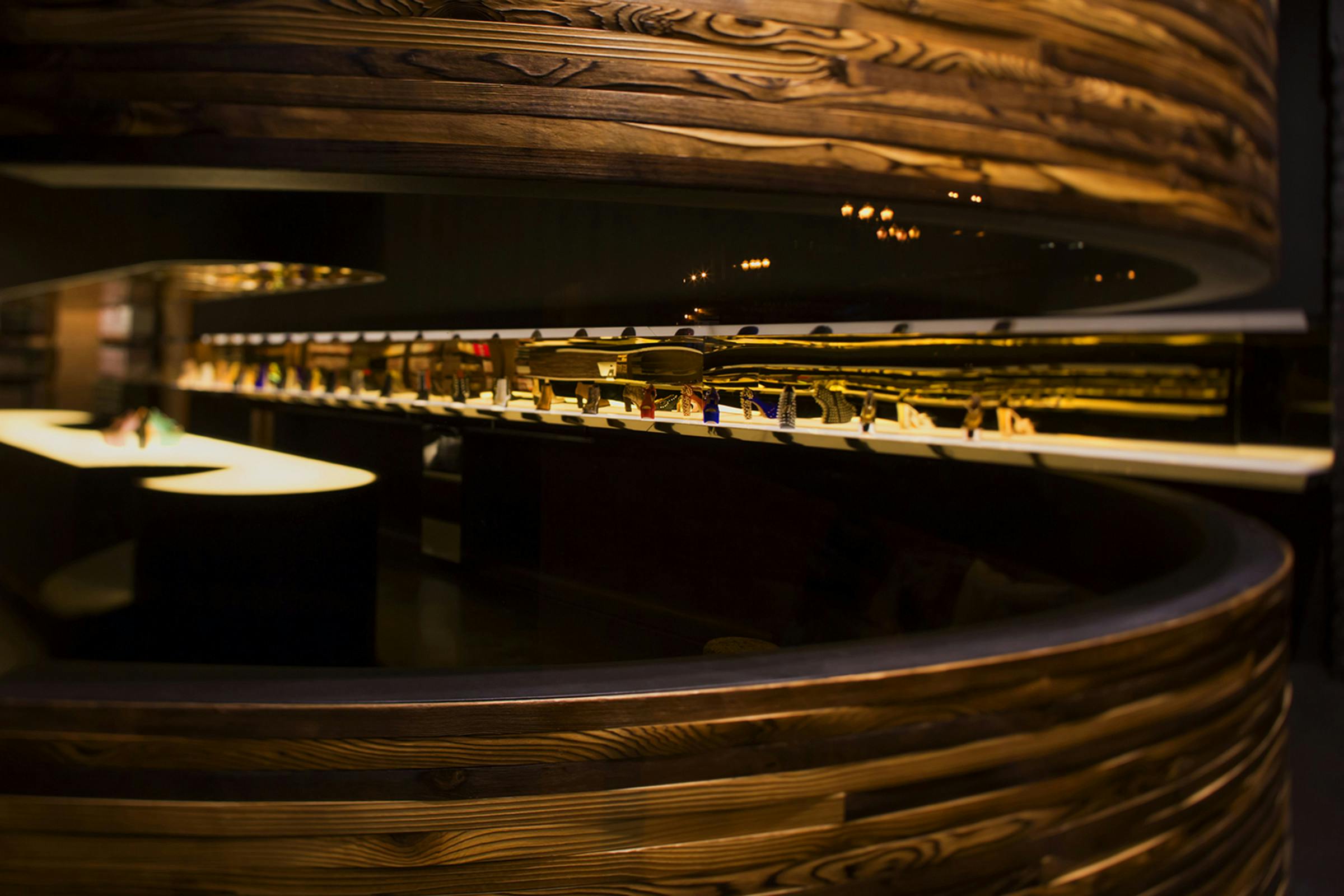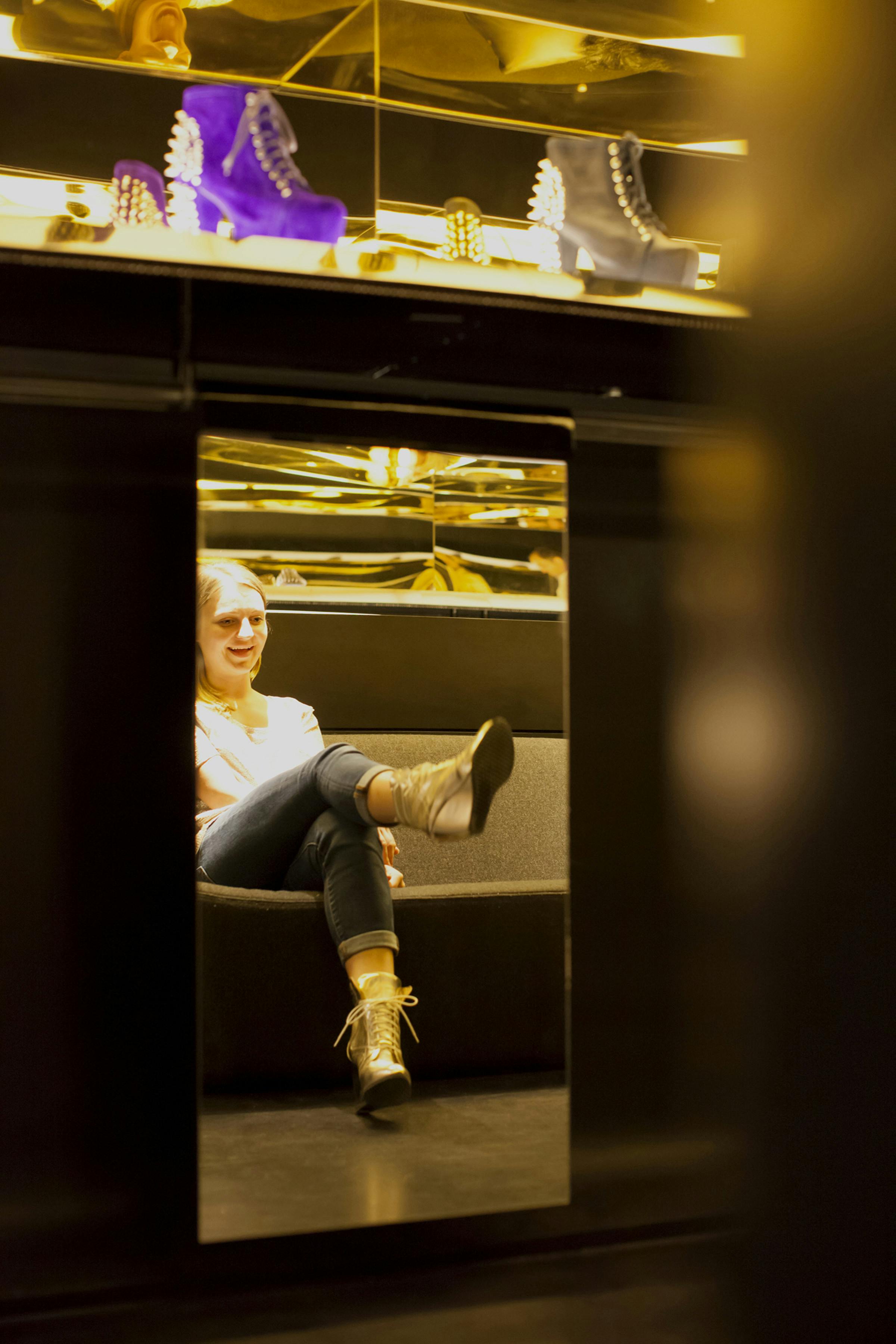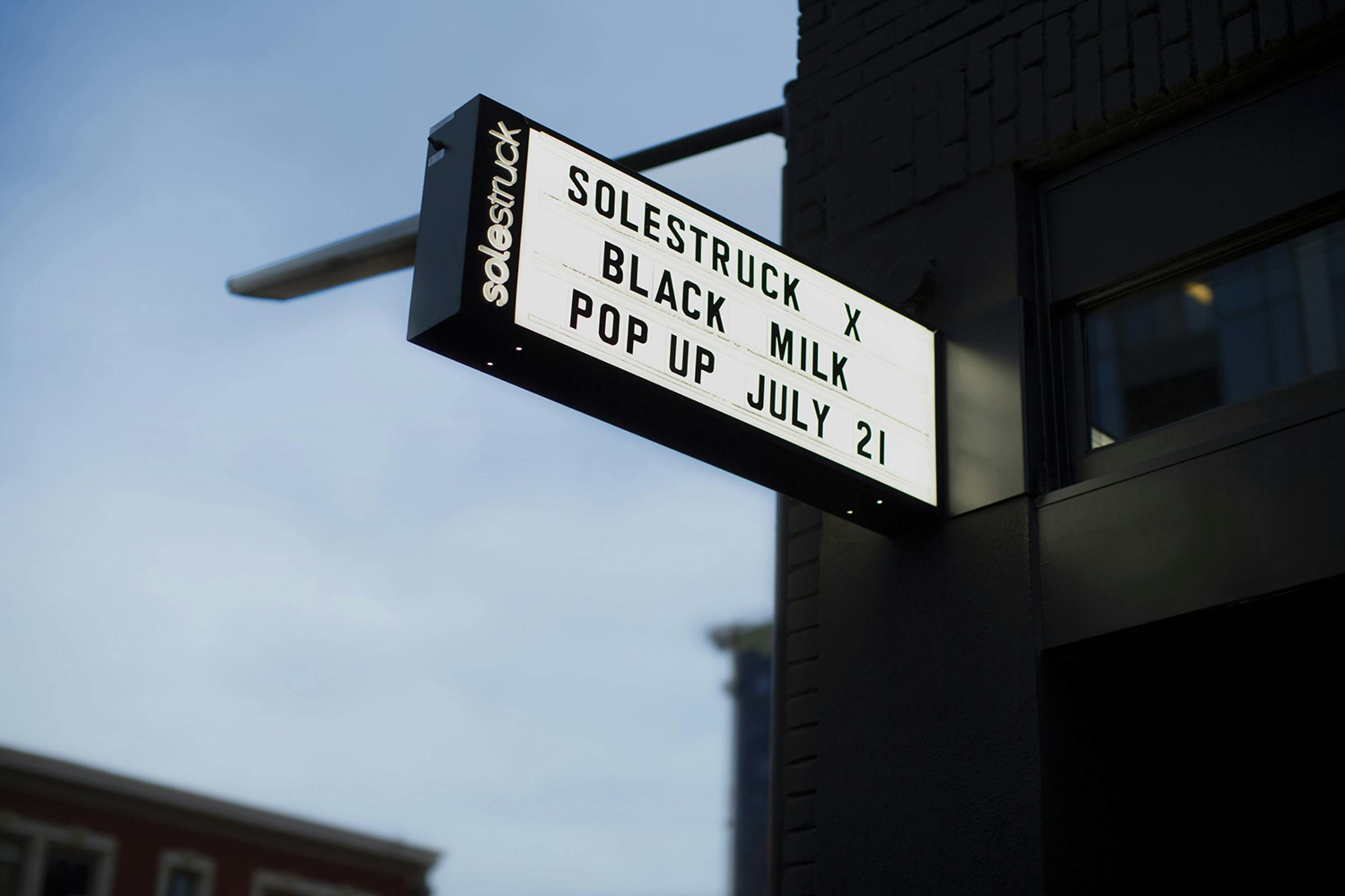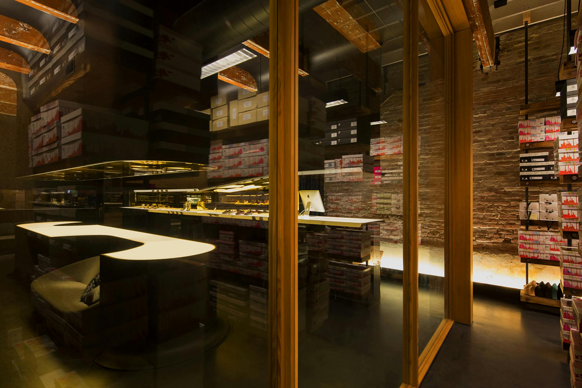 Solestruck’s mission is “to rid the world of ugly shoes, one pair at a time.” For their flagship retail store, the popular web-based company selected a space in Portland’s Blackbox retail project. The display zone is a high concept “shop-dark” where the all-black concrete floors, textured-coated walls, and brake form metal shelves fade away to reveal glowing swaths of light that dramatize curated exhibits of shoes. Carved and coved out of a columnar structure, the central cabinet integrates display & storage space, as well as custom-upholstered seating notched into the mass.In contrast to the drama of the display zone, the back-of-house is warm and expressive. Drawing on a wine cellar concept, backstock storage is exposed and celebrated as a collection. Clad in cork and exposed brick walls, this secondary zone is highly visible yet just out of reach to the public, separated by a floor to ceiling glass wall. By virtue of the frequent events and collaborations held in the space, the expanses of glass at the storefront and back of house provide ample space for ever-changing vinyl graphics. A custom marquee-style sign on the exterior alerts the neighborhood and clientele of upcoming events. Dramatically contrasting the dark and light elements of the shop and providing a flexible, versatile environment make this space the ultimate shoe store and event space.