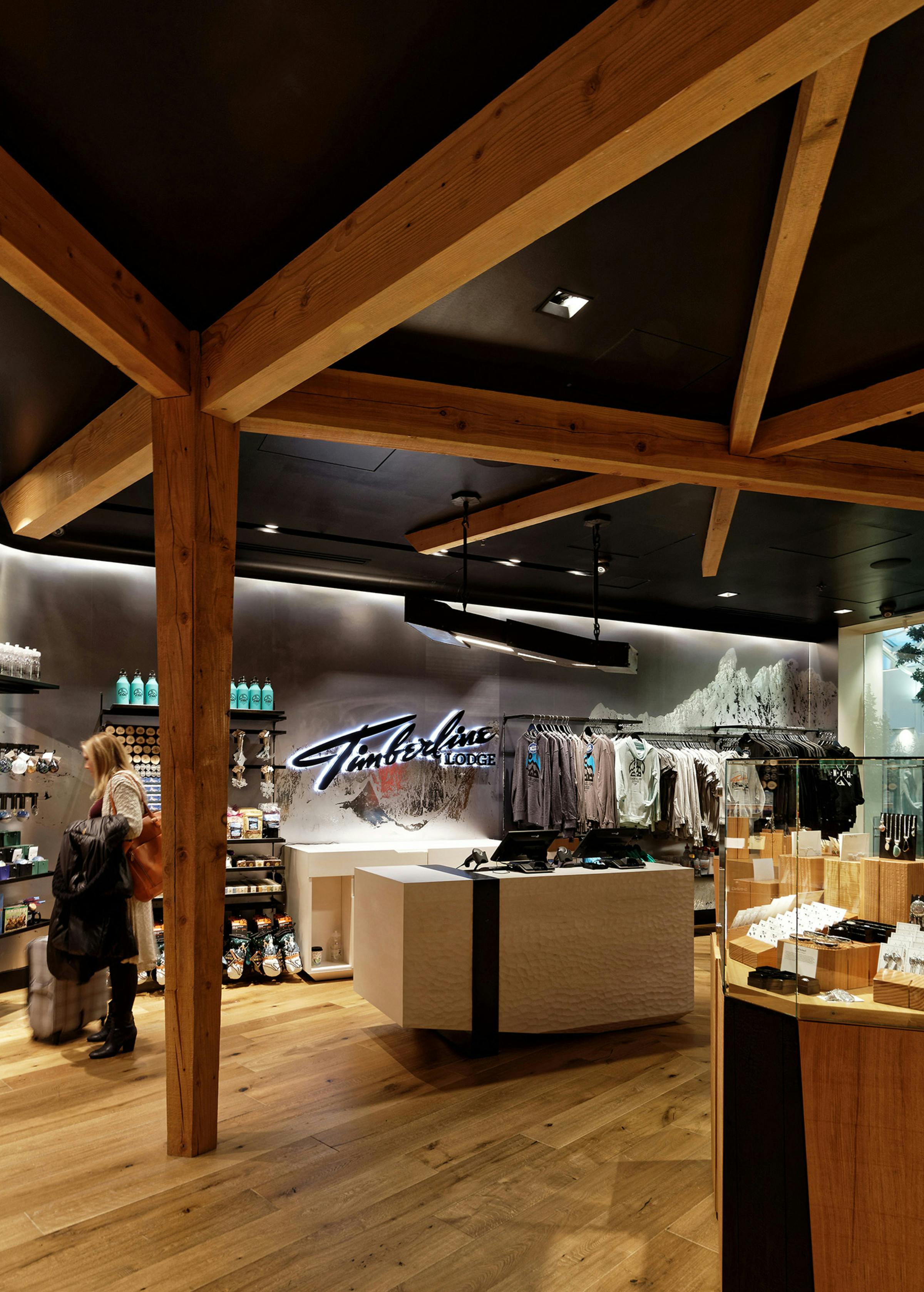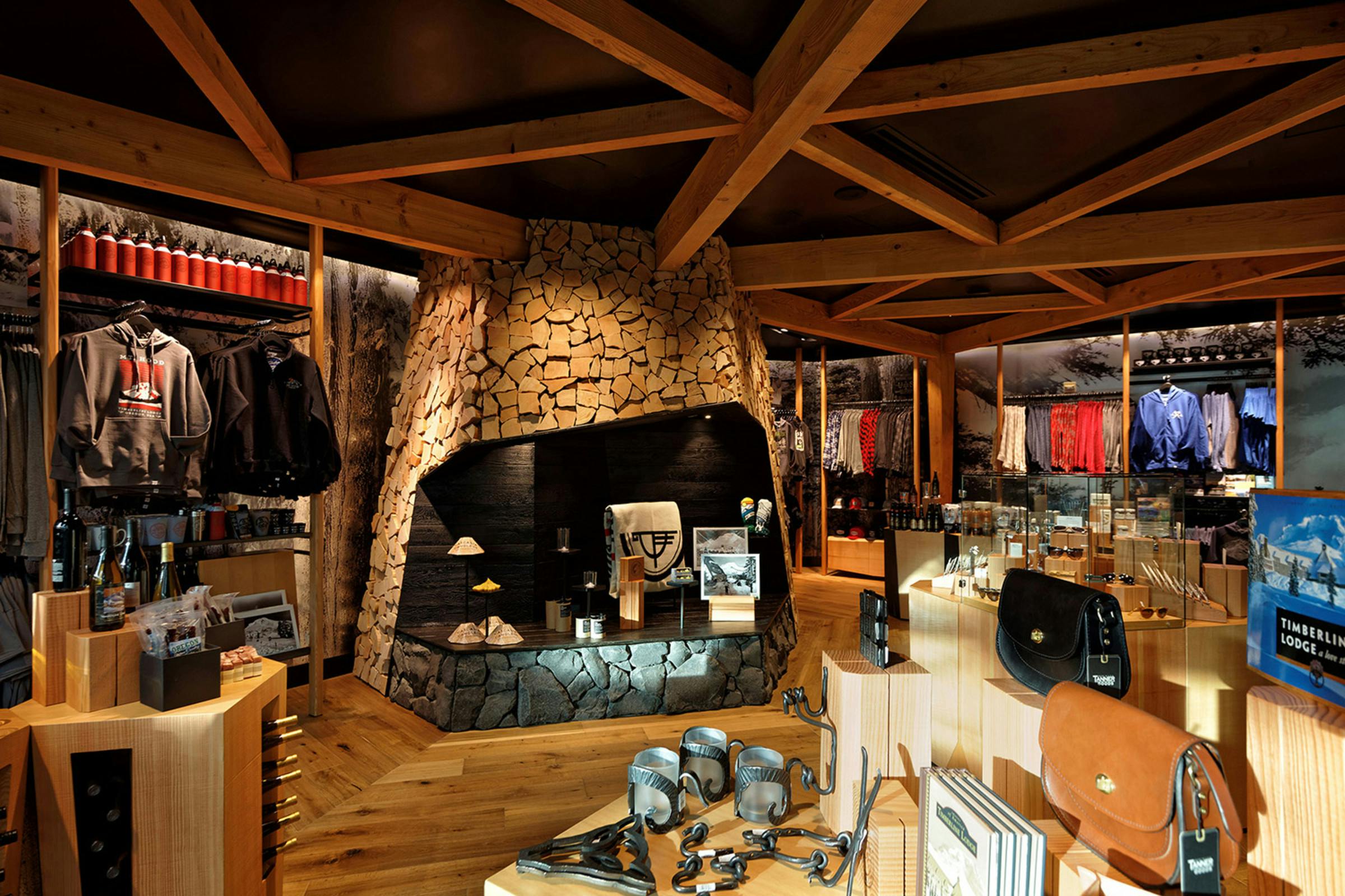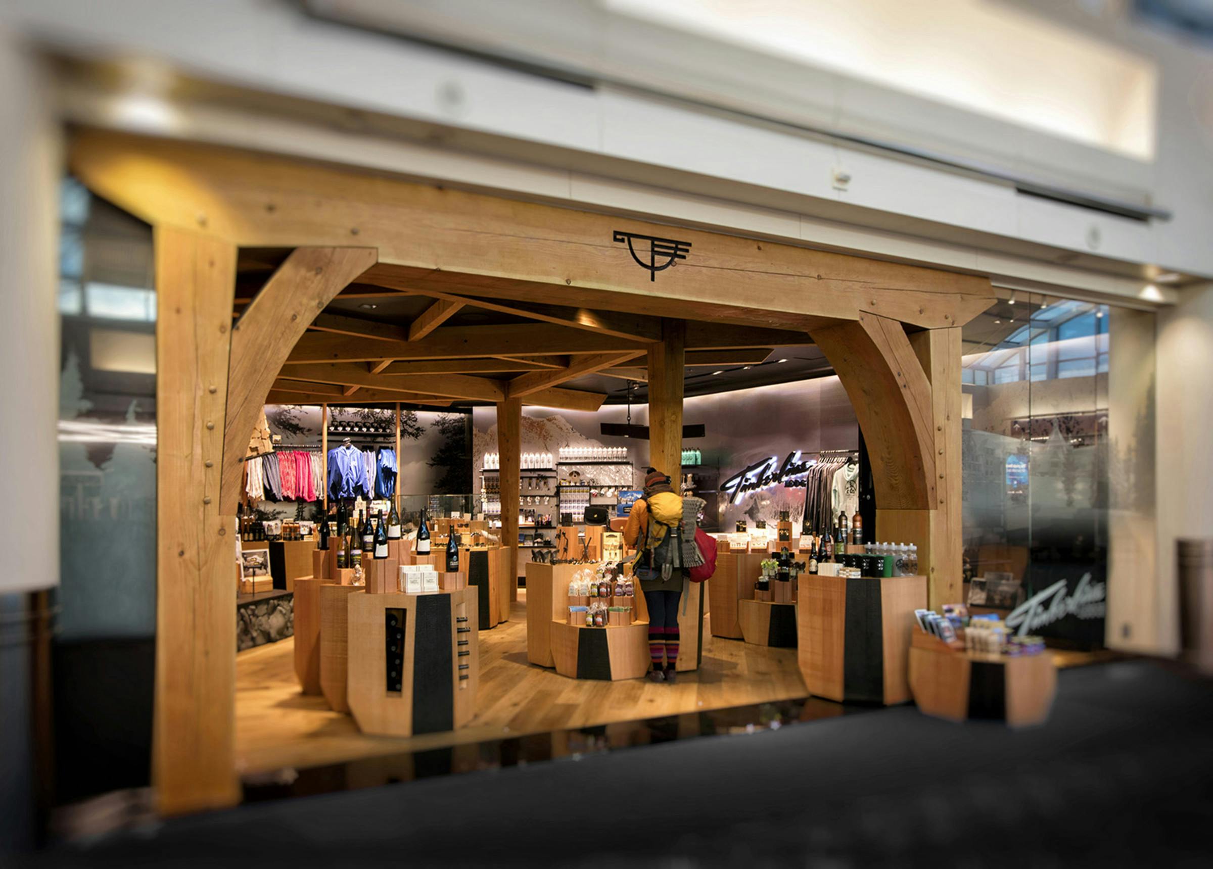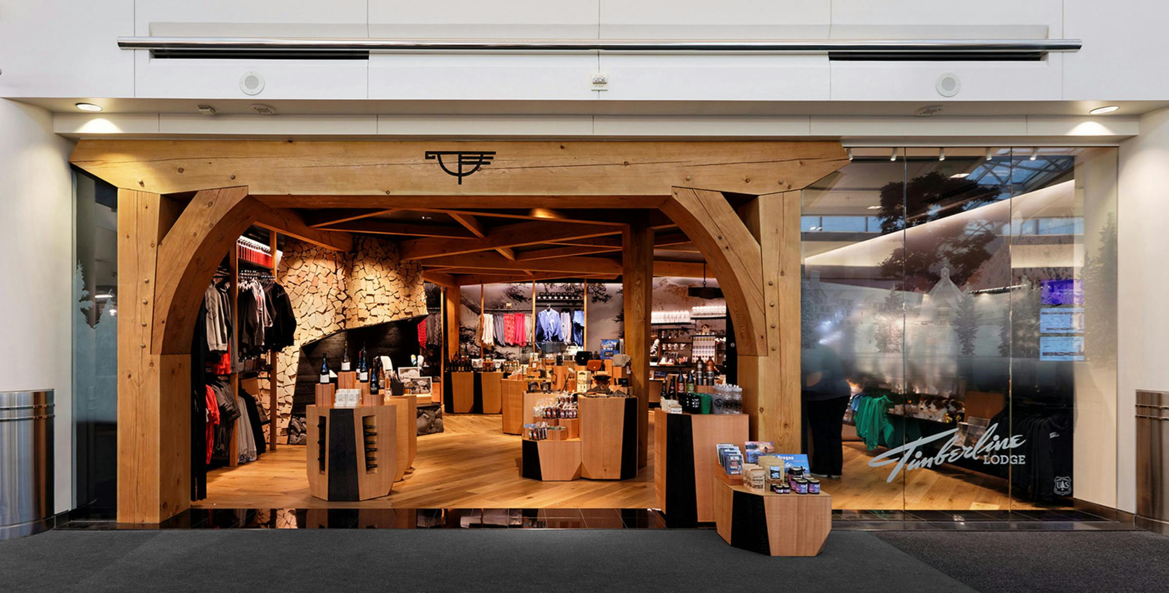 Timberline Lodge’s retail outpost at the Portland International Airport embodies the history, architecture and legacy of artisan craftsmanship found in the original Timberline Lodge on the slopes of Mt. Hood, bringing this unique experience closer to the city of Portland and more importantly to a national and international audience of visitors moving through the global travel hub. The space is bookended by images of the majestic forest on one side and the open slopes of the Mt. Hood on the other, transporting customer to the exterior landscapes surrounding Timberline. At the center of it all is a hearth connected to a timber frame entry arch intentionally mirroring the sloping arches found in the original New Deal-era construction. Throughout the space the stories of artists, athletes, explorers and adventurers who are part of the Timberline Lodge community are told through objects, images, and words. The Timberline heritage connects the environment, enabling travellers just passing through PDX to experience a regional landmark firsthand.