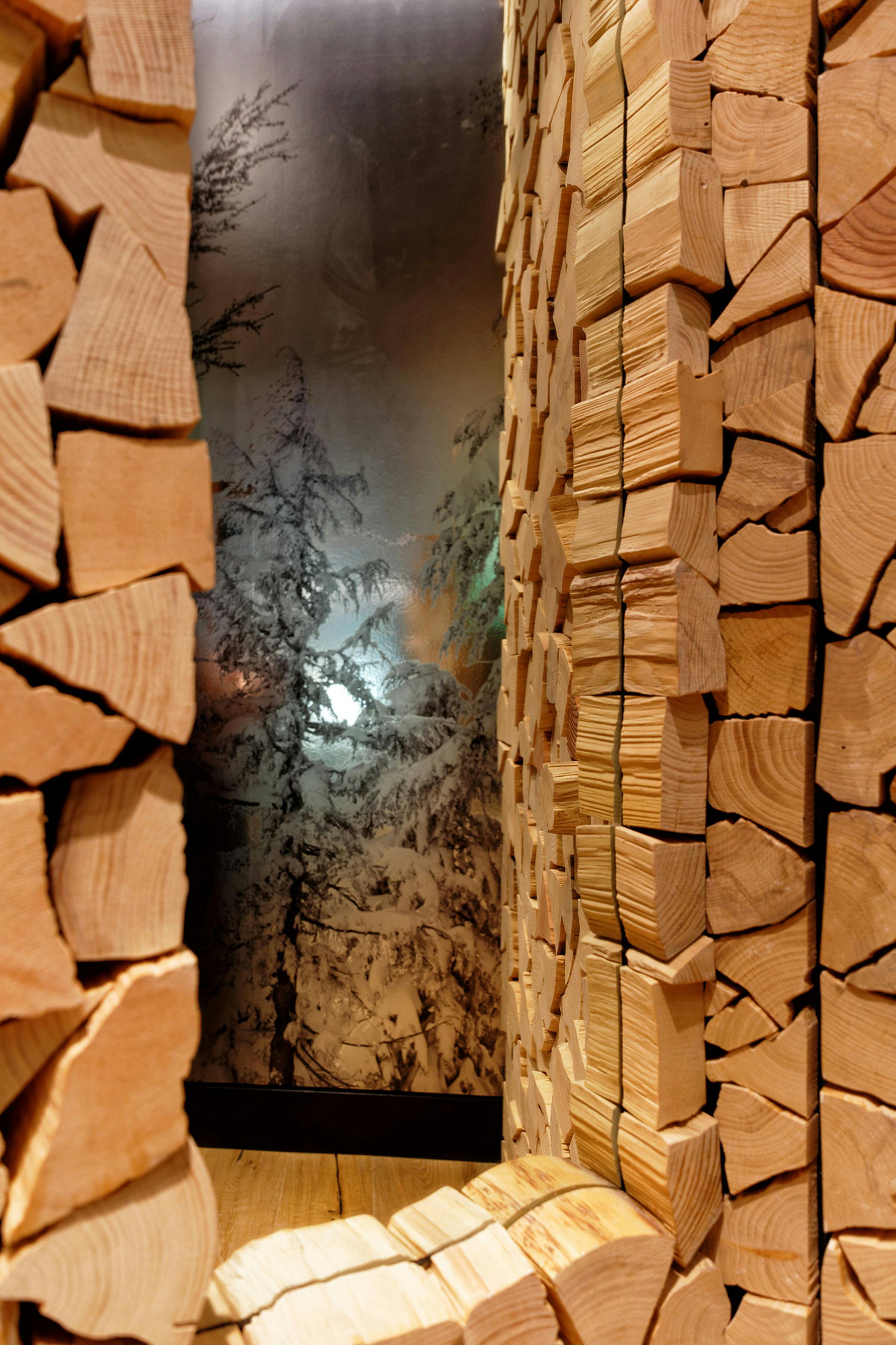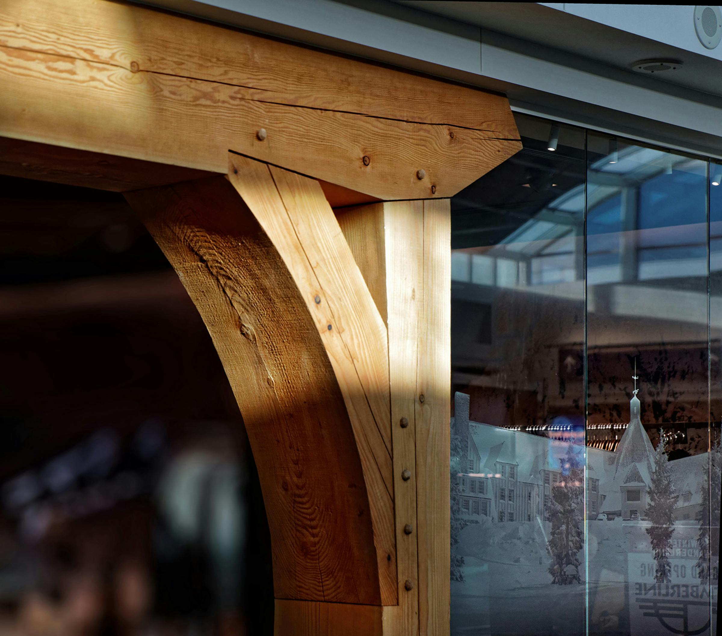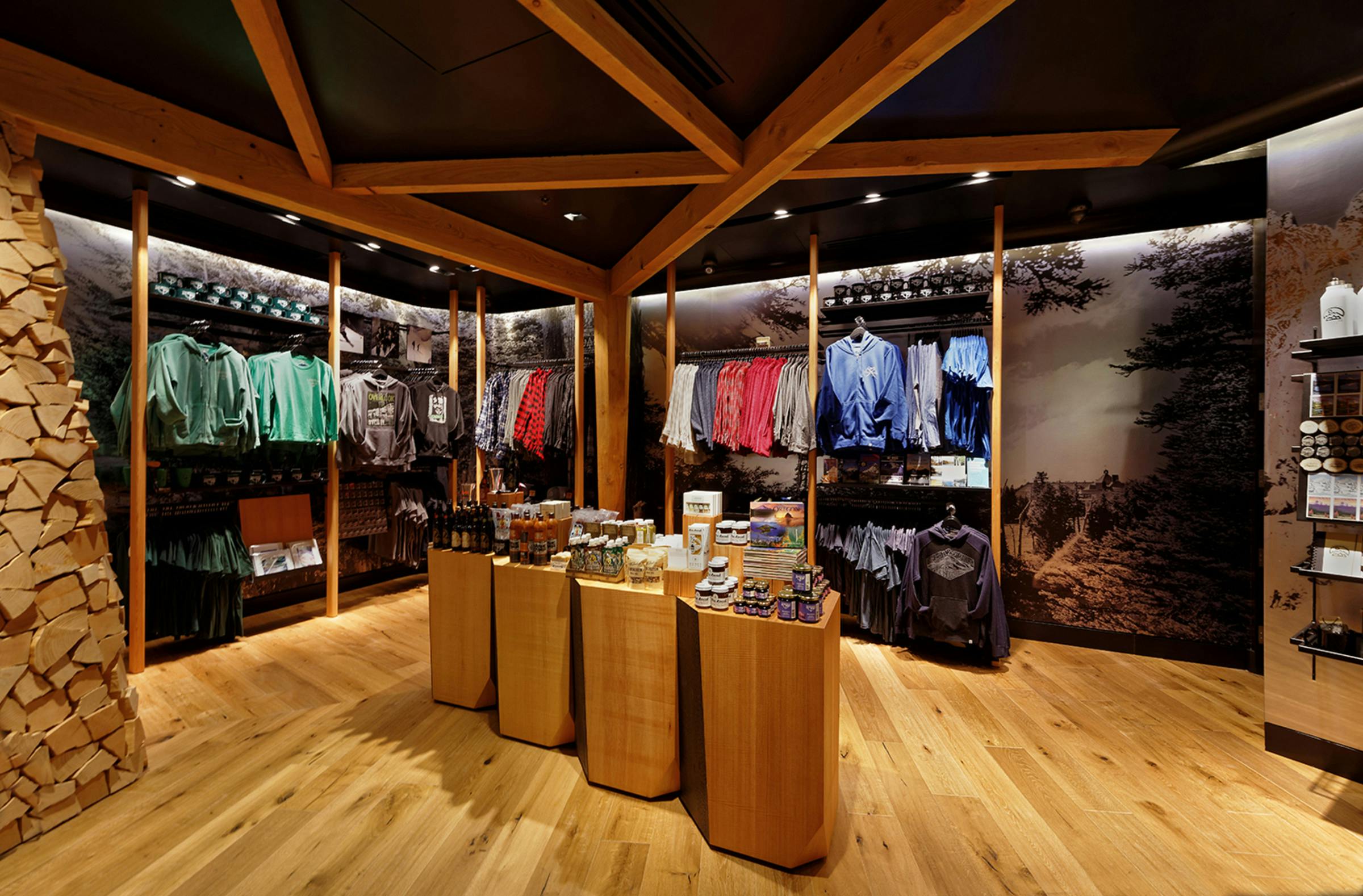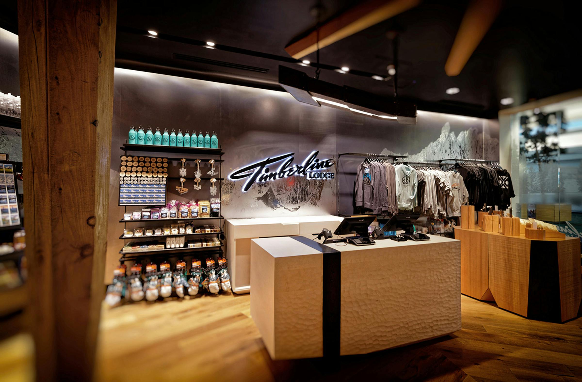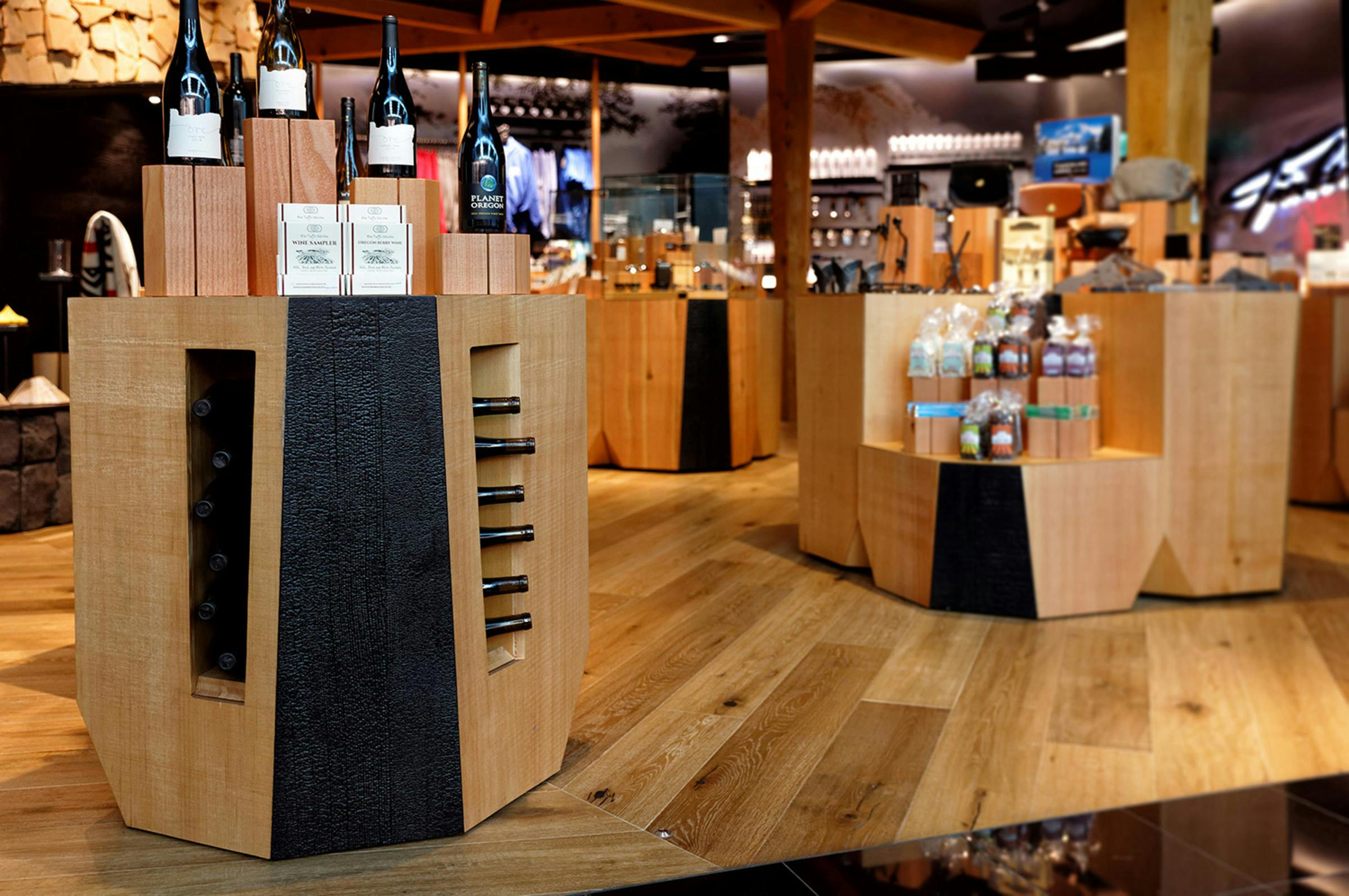 Timberline Lodge’s retail outpost at the Portland International Airport embodies the history, architecture and legacy of artisan craftsmanship found in the original Timberline Lodge on the slopes of Mt. Hood, bringing this unique experience closer to the city of Portland and more importantly to a national and international audience of visitors moving through the global travel hub. The space is bookended by images of the majestic forest on one side and the open slopes of the Mt. Hood on the other, transporting customer to the exterior landscapes surrounding Timberline. At the center of it all is a hearth connected to a timber frame entry arch intentionally mirroring the sloping arches found in the original New Deal-era construction. Throughout the space the stories of artists, athletes, explorers and adventurers who are part of the Timberline Lodge community are told through objects, images, and words. The Timberline heritage connects the environment, enabling travellers just passing through PDX to experience a regional landmark firsthand.