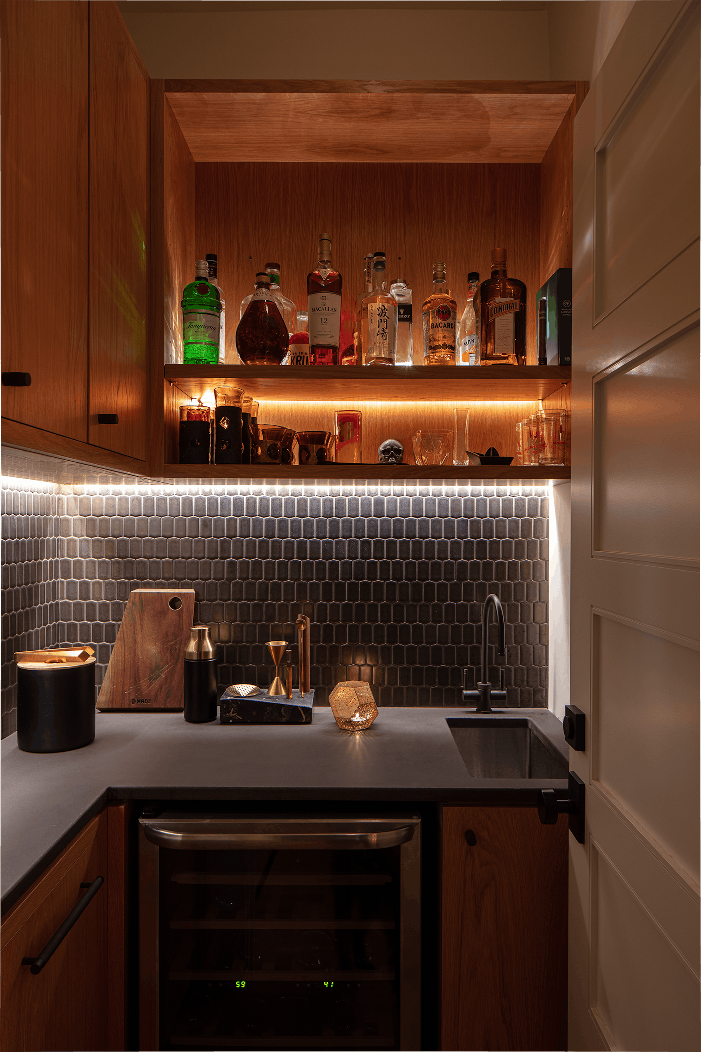 Skylab worked with Made to develop a modern casework solution, installed to resemble the freestanding furniture within the framework of the historic wood paneling.