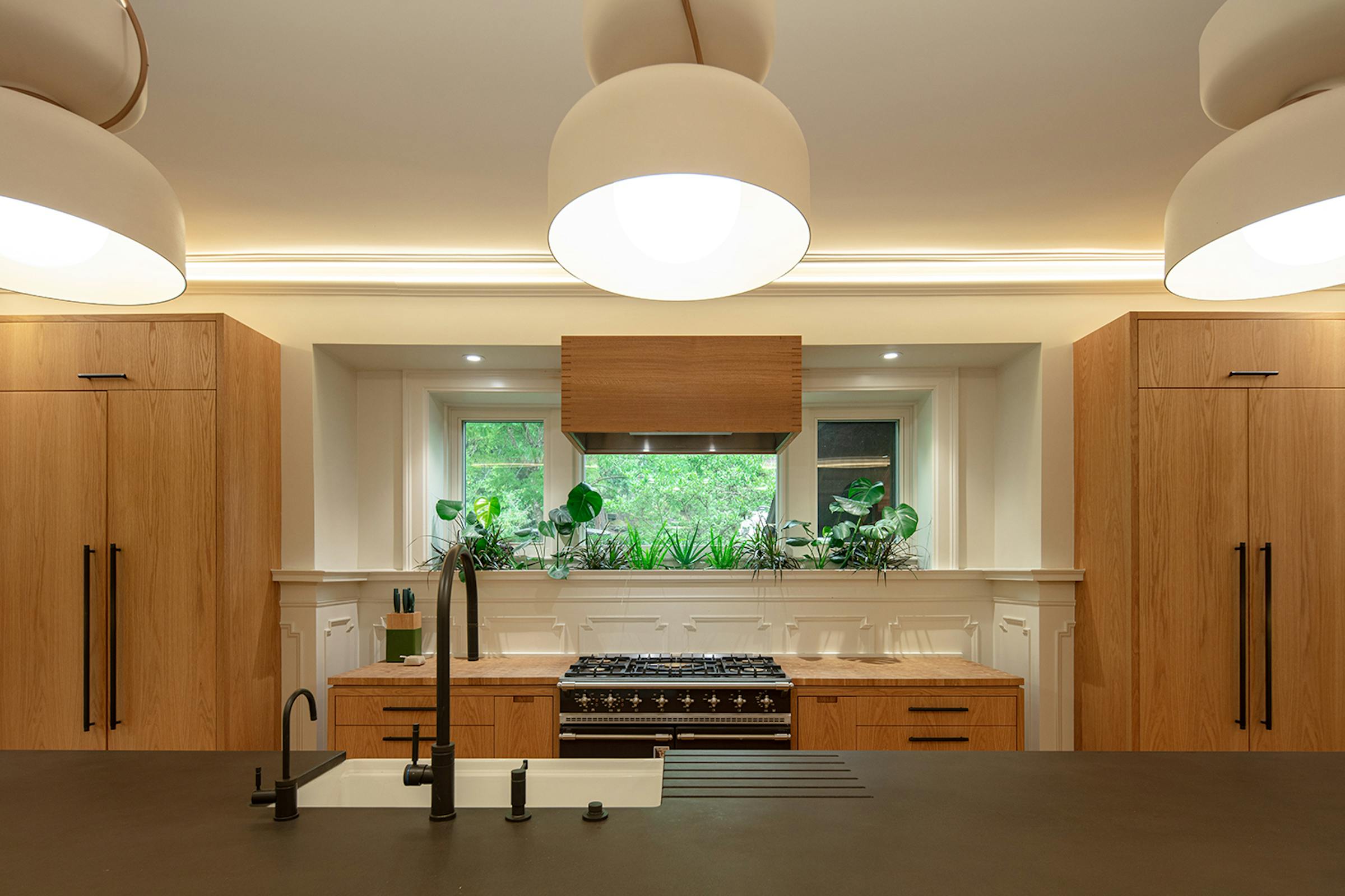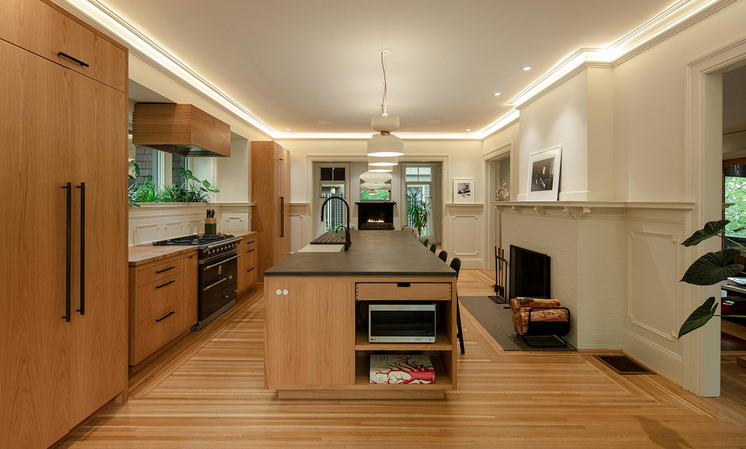 The kitchen is now at the heart of the house relocated in the historic dining room.