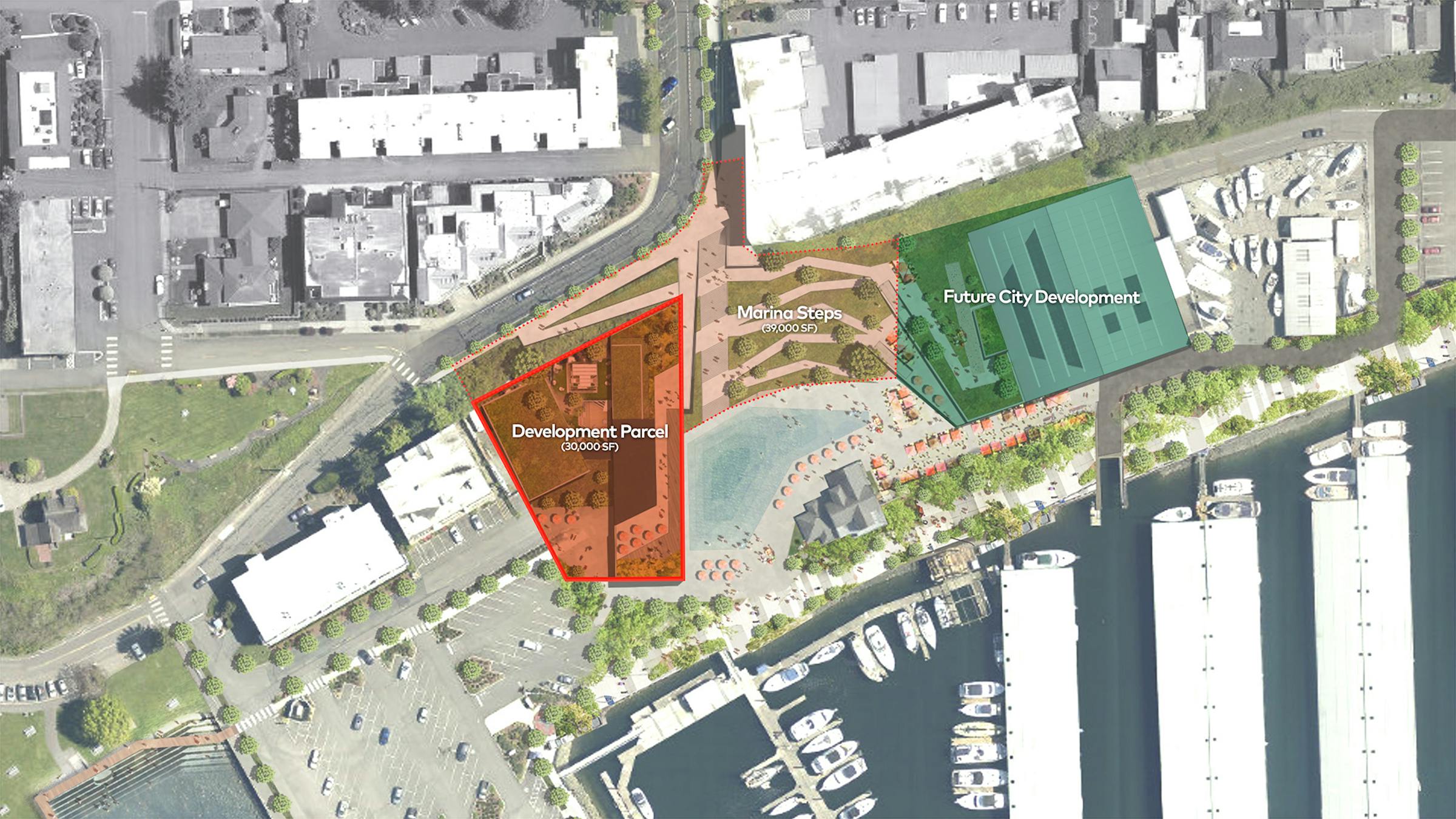 The Marina Steps is the first phase in a masterplan that includes the development of various public amenities in conjunction with adjacent parcels for private development. Located at the existing Des Moines Marina, facilities currently include 730 boat slips (uncovered and open), a working boatyard, dry storage, an esplanade, and public access areas to the Puget Sound for fishing and recreation. The Marina Steps project will be a 44,856-square-foot activity hub connecting to the 223rd Street Watershed project to the east, development sites Parcel A and B to the north and south respectively, and future Plaza and Marina projects to the west. The steps and switchback ramps will provide universal access while navigating the 36-foot elevation change with lookouts along the pathway. The terraced landscape will include driftwood timbers reminiscent of the natural rugged Washington waterfront creating places to pause and sit along the way for views of the working waterfront.